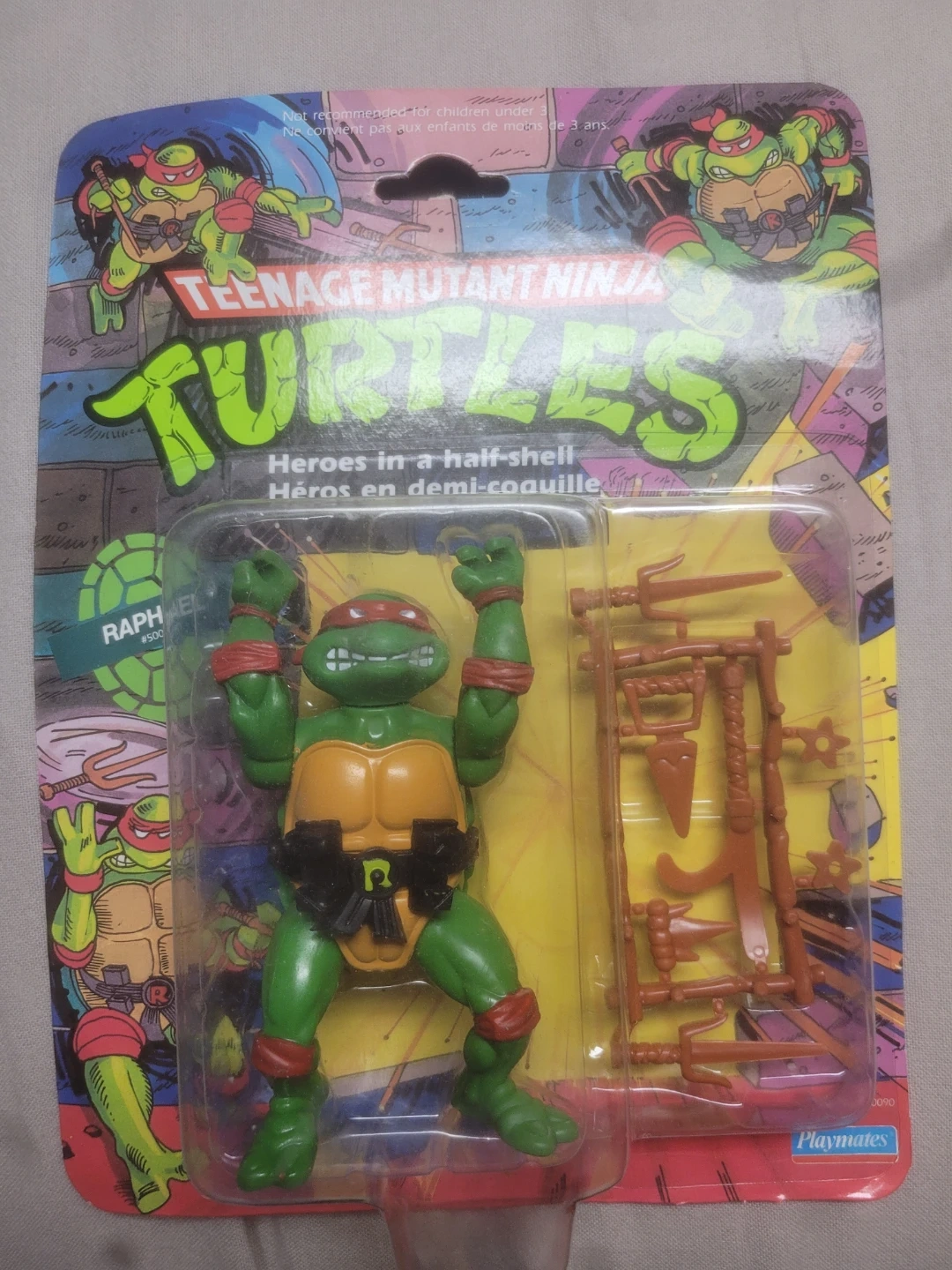 Selling a vintage Teenage Mutant Ninja Turtles Raphael action figure, still in its original packaging! This classic toy from Playmates Toys is a must-have for any TMNT collector. Package dated 1989