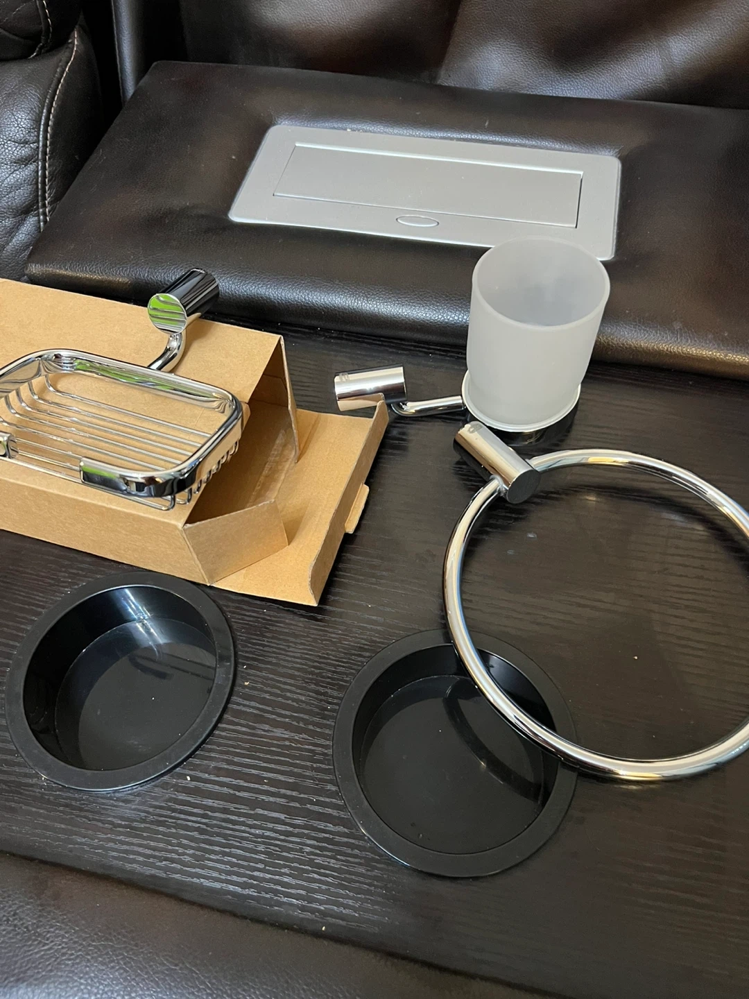 Brand new items: Includes a chrome soap dish with a holder, a frosted glass tumbler, and a chrome towel ring. Also comes with two black circular base inserts. These bathroom accessories are made with a chrome finish and glass.