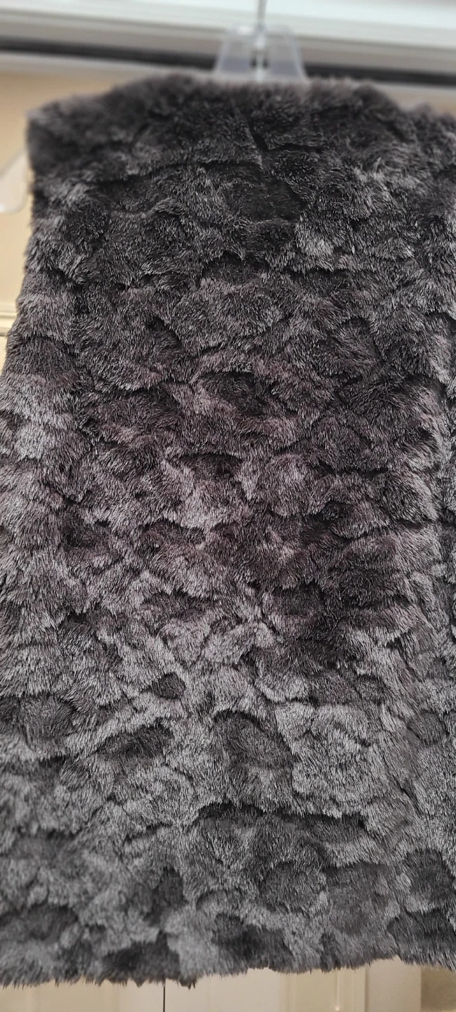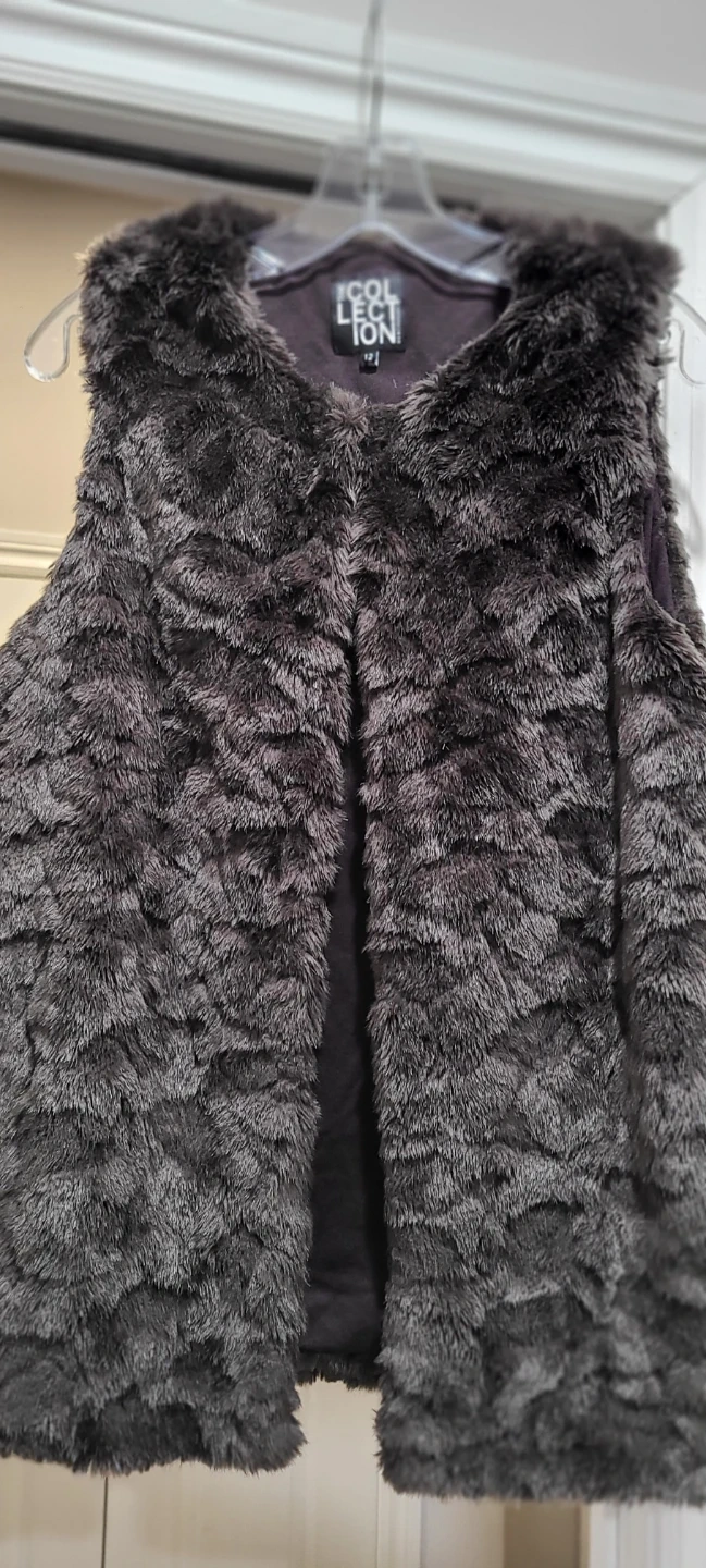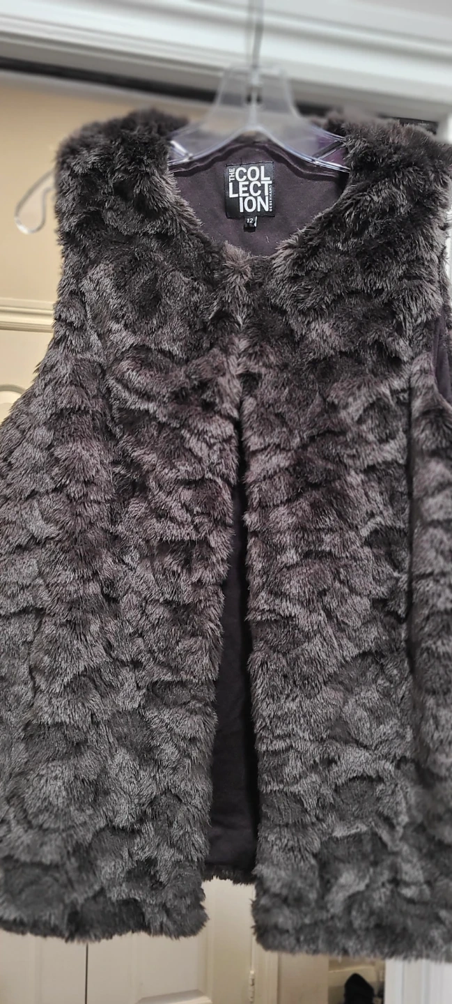 This faux fur vest from THE COLLECTION is a stylish layering piece. It's dark grey with a soft, plush texture. The lining appears to be a smooth, dark fabric. USA women size 8