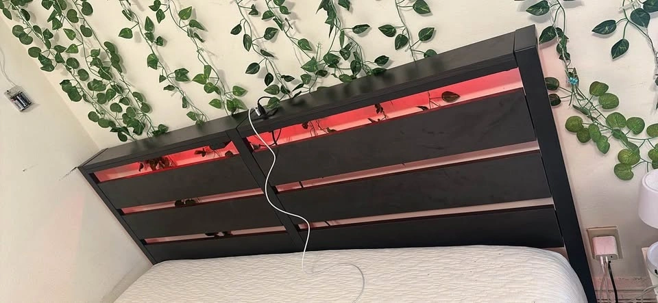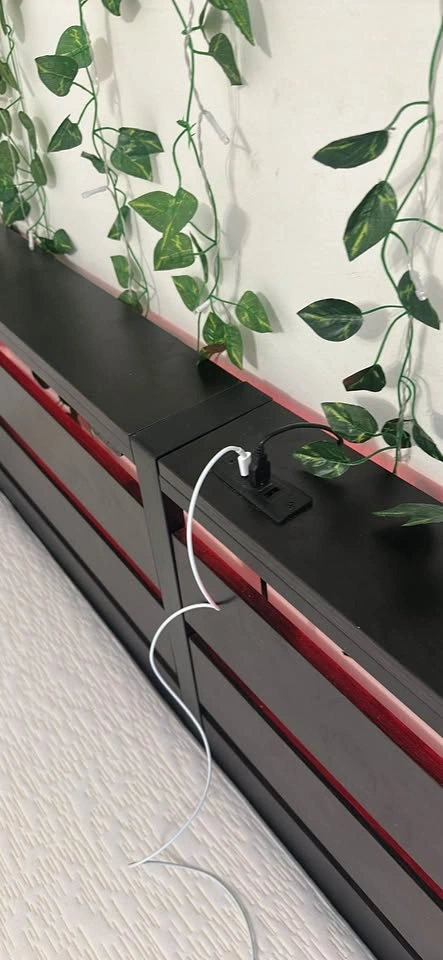 Comfortable mattress with a sturdy bed frame and modern headboard. The headboard includes LED lighting and built-in charging ports (USB & USB-C) for phones and devices. It's clean and well maintained, with minor wear on the mattress. Supportive and comfortable for everyday use. Selling because I’m moving.