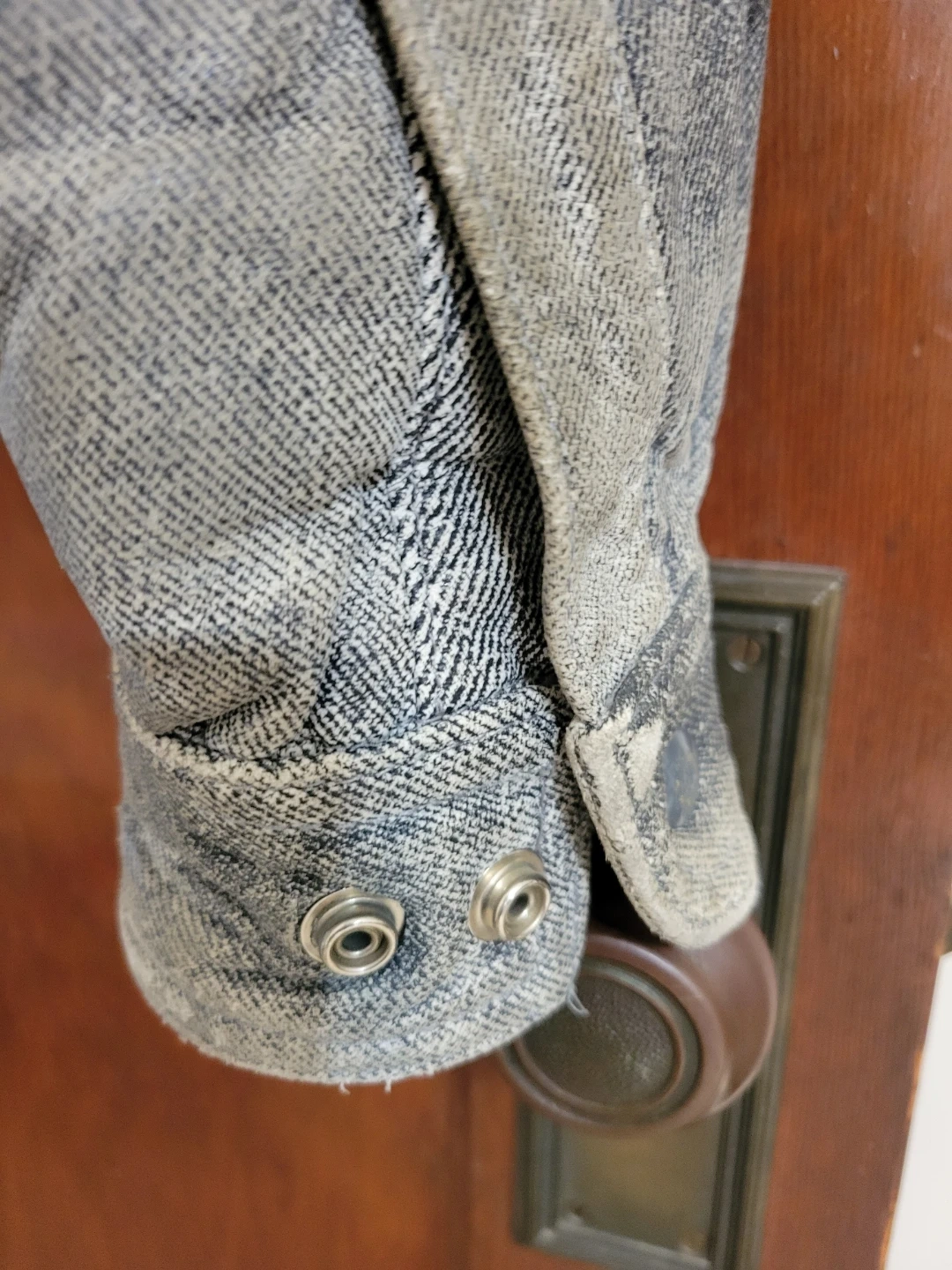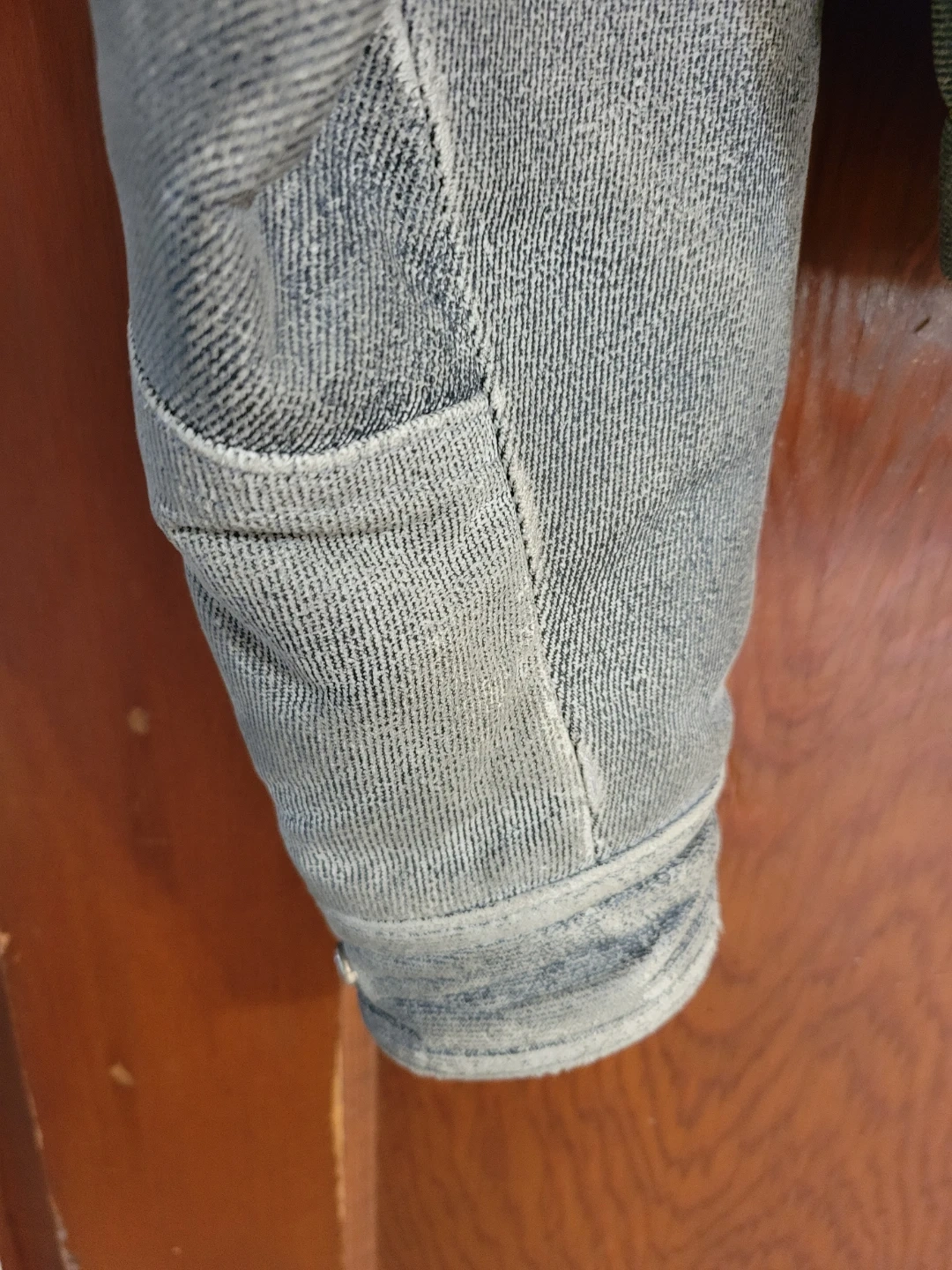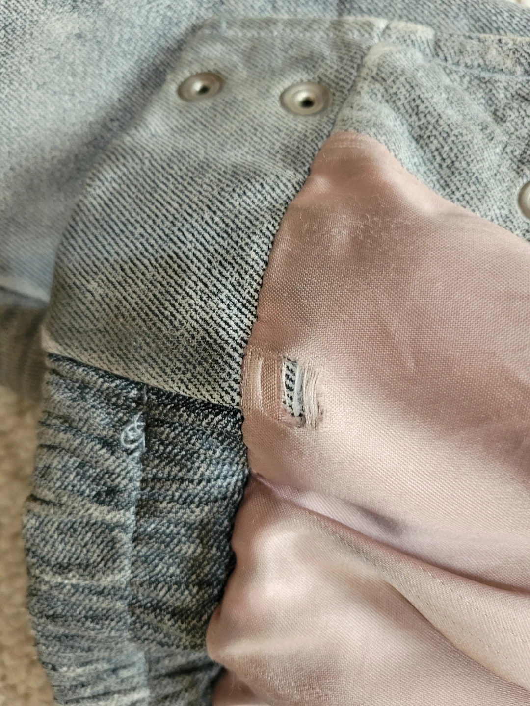 This is a grey genuine leather bomber jacket. The outershell is 100% genuine leather, and the lining is 100% acetate. Made in Canada.Denim styled leather jacket sold by Leather Ranch in the 80's. 2 small holes at bottom of the back lining. Sleeves zip off to convert to a vest.