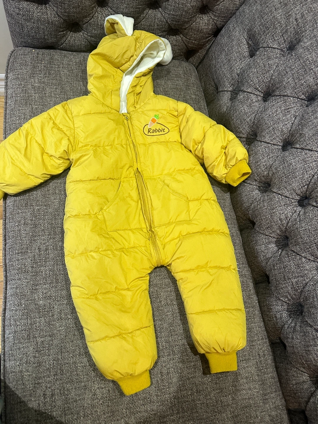 Keep your little one warm this winter with this adorable yellow padded snowsuit from Rabbit! It features a cozy hood and a full-length zipper for easy dressing