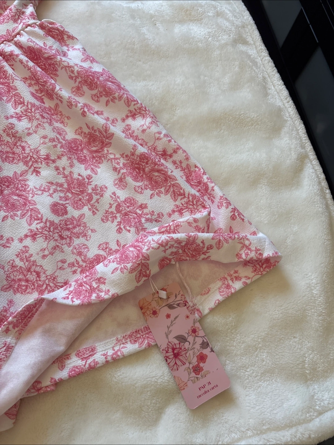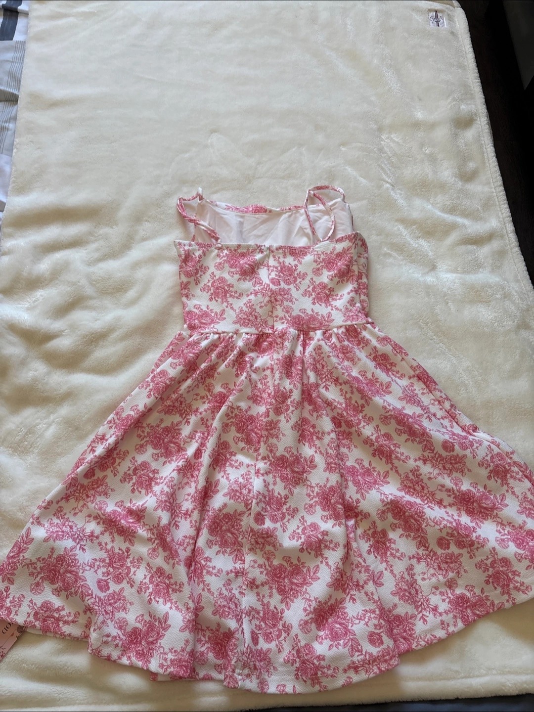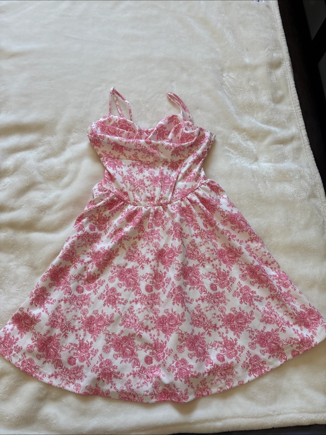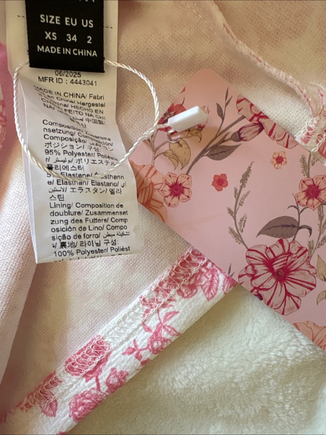 Selling a cute Raccolta Carta dress in size XS. It features a lovely pink and white floral pattern. The dress is made of 95% polyester and 5% elastane, with a 100% polyester lining