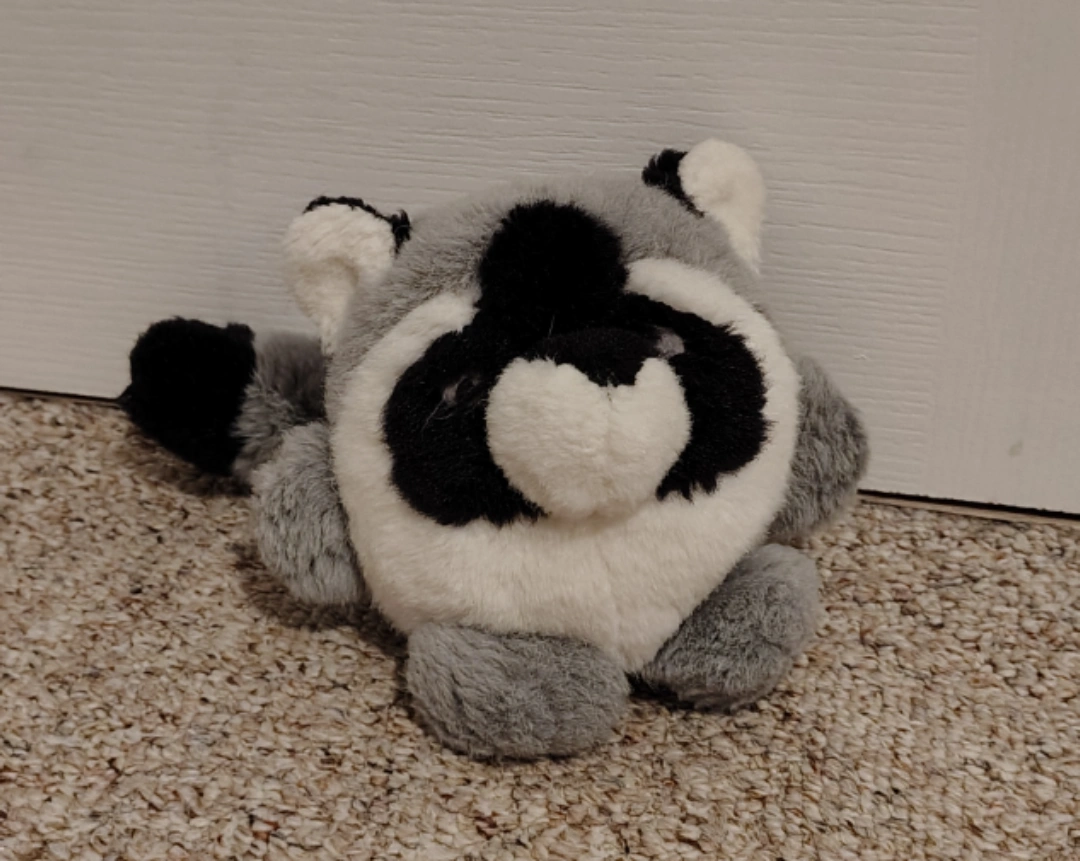 A cute and cuddly raccoon plush toy looking for a new home! It's in good condition and ready for snuggles. makes rattler noises!