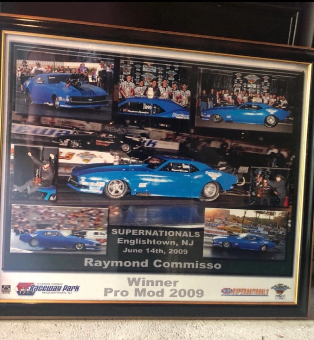 Framed photo of a blue car. The photo includes the name Raymond Commisso and details from the Raceway Park Pro Mod event in 2009.