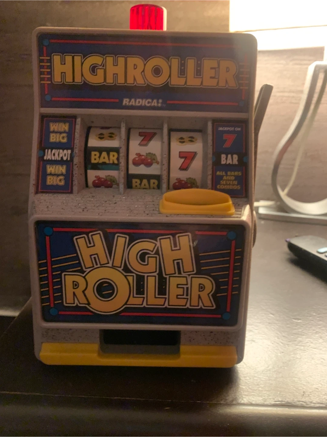 Selling a Radica High Roller slot bank. It's in great shape and ready for a new home! This fun slot bank is perfect for adding a bit of casino flair to your space. It's marked as 'Not a Gaming Device' and suitable for ages 8 and up.