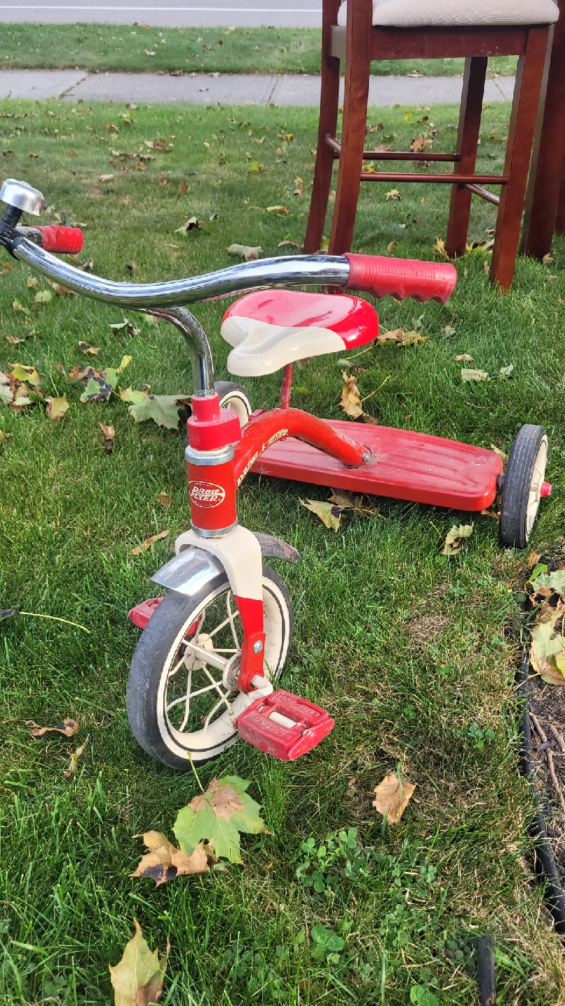 117Selling a classic Radio Flyer tricycle! It's red and in good condition, perfect for a little one learning to ride. It has some signs of use, but it's ready for a new home and more adventures.