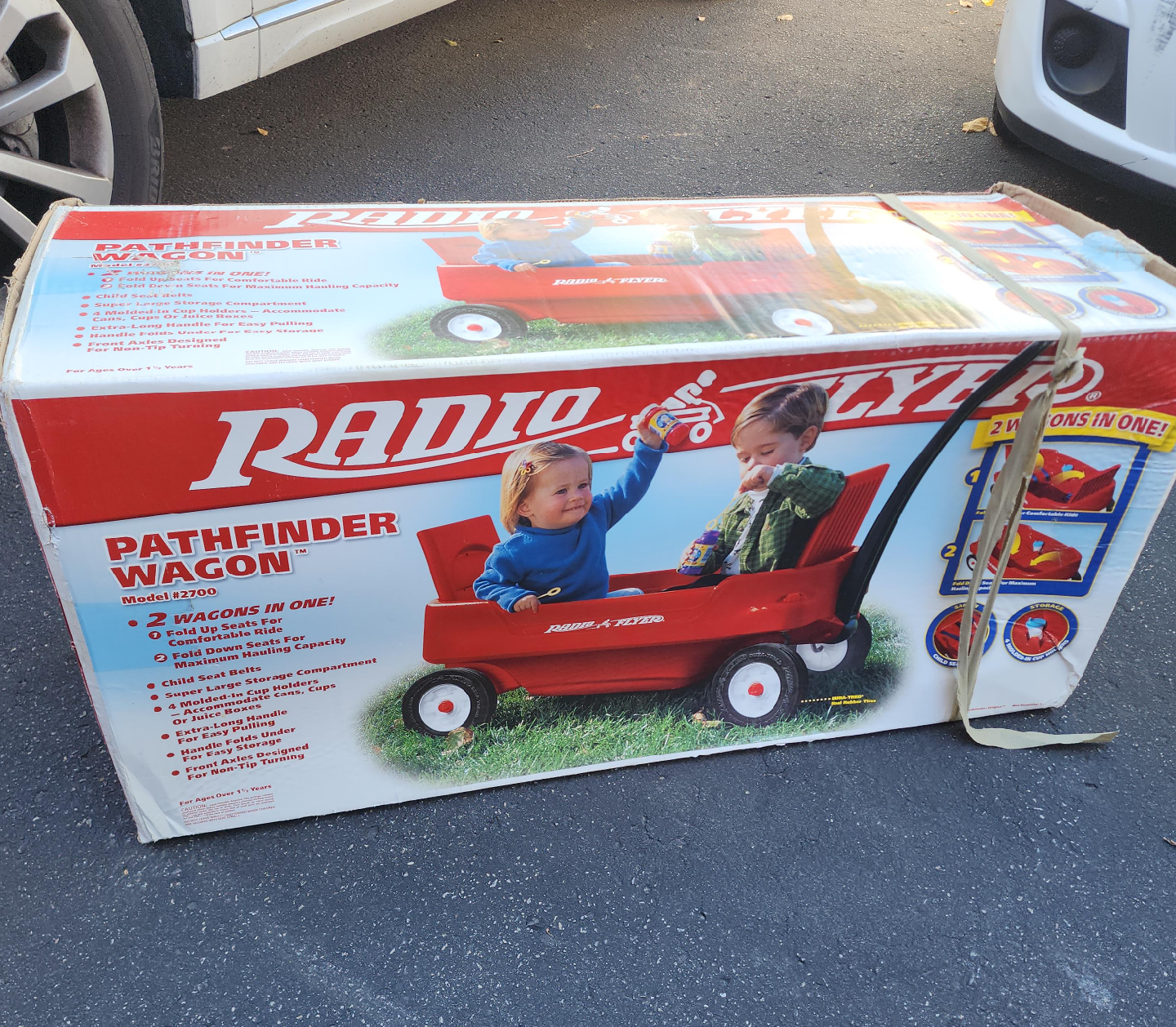 60Selling a Radio Flyer Pathfinder Wagon, model #2700! This wagon is a 2-in-1, featuring fold-up seats for a comfortable ride and fold-down seats for maximum hauling capacity. It also has child seat belts, a super large storage compartment, and four molded-in cup holders for drinks or juice boxes. The extra-long handle makes pulling easy, and it folds under for easy storage. The front axles are designed for non-tip turning. Perfect for ages over 1 1/2 years!