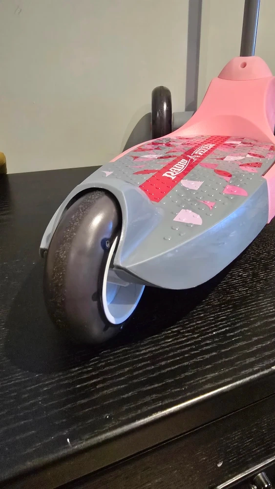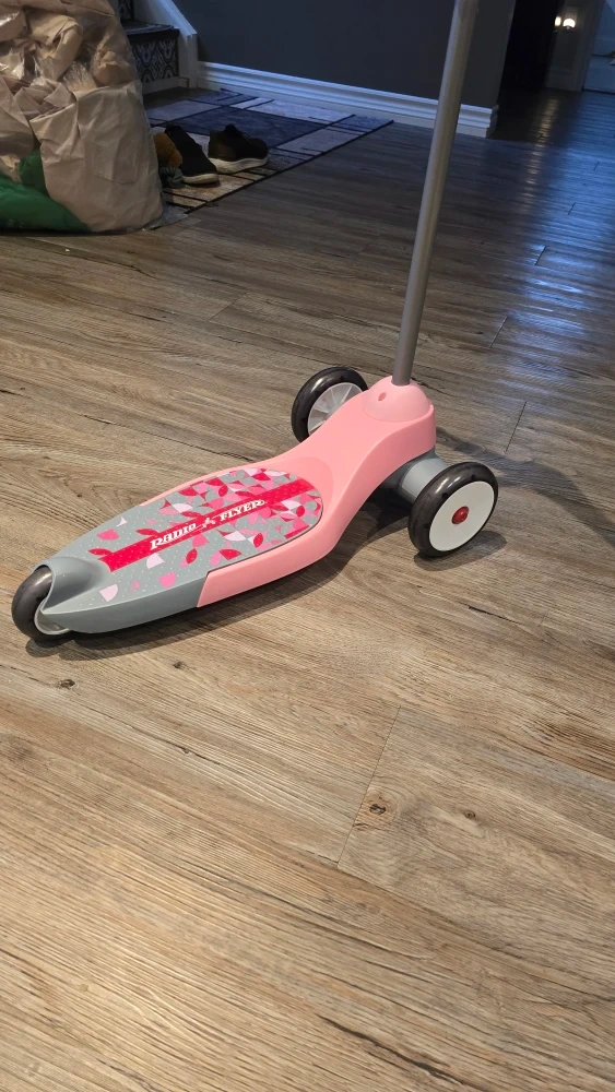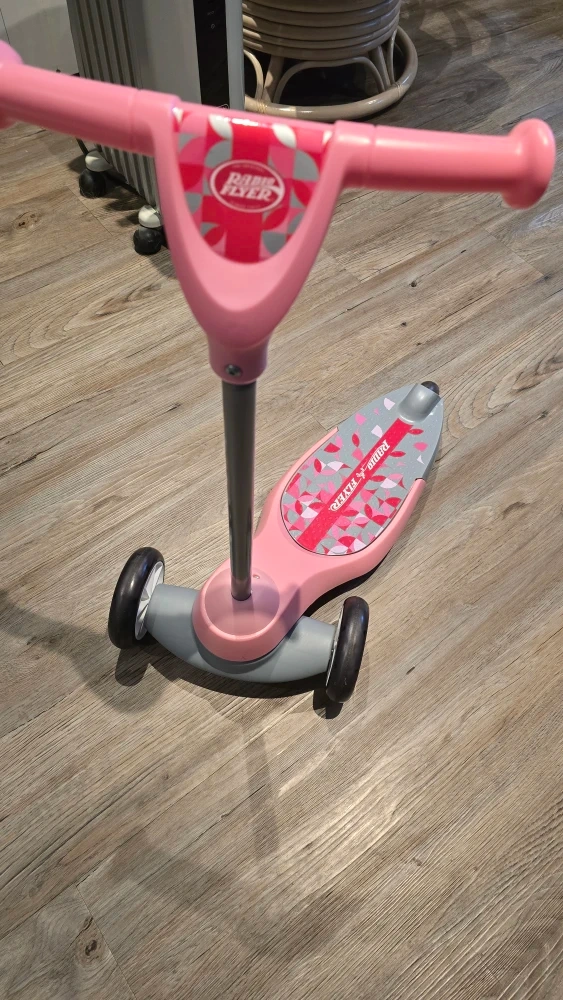 60Very little used, waiting for its next little owner. Radio Flyer kids scooter in pink! It's a great scooter for young children learning to balance and ride. recommended for children 2,-5 It has a sturdy three-wheel design for stability and a cute pink and grey colour scheme.