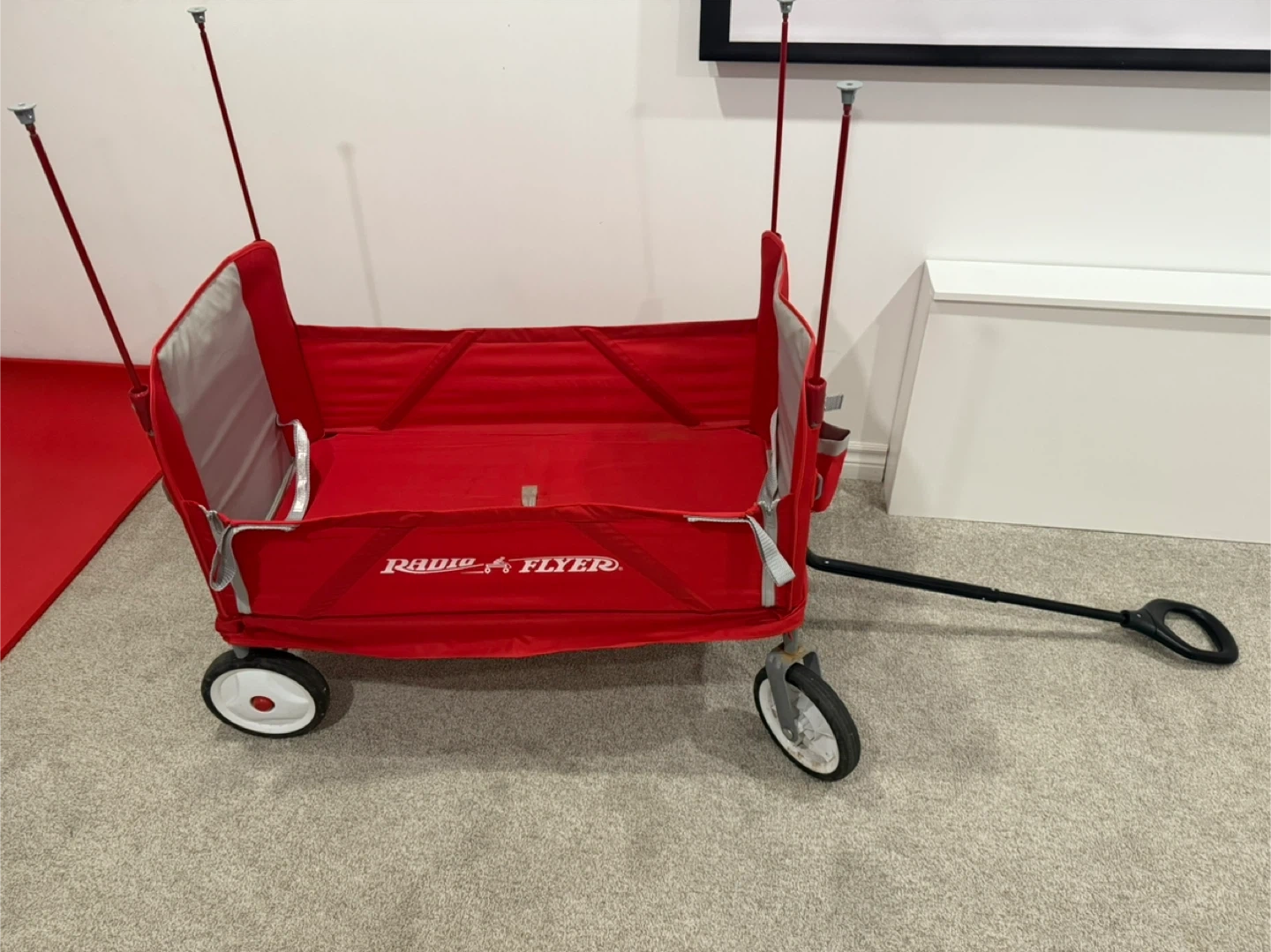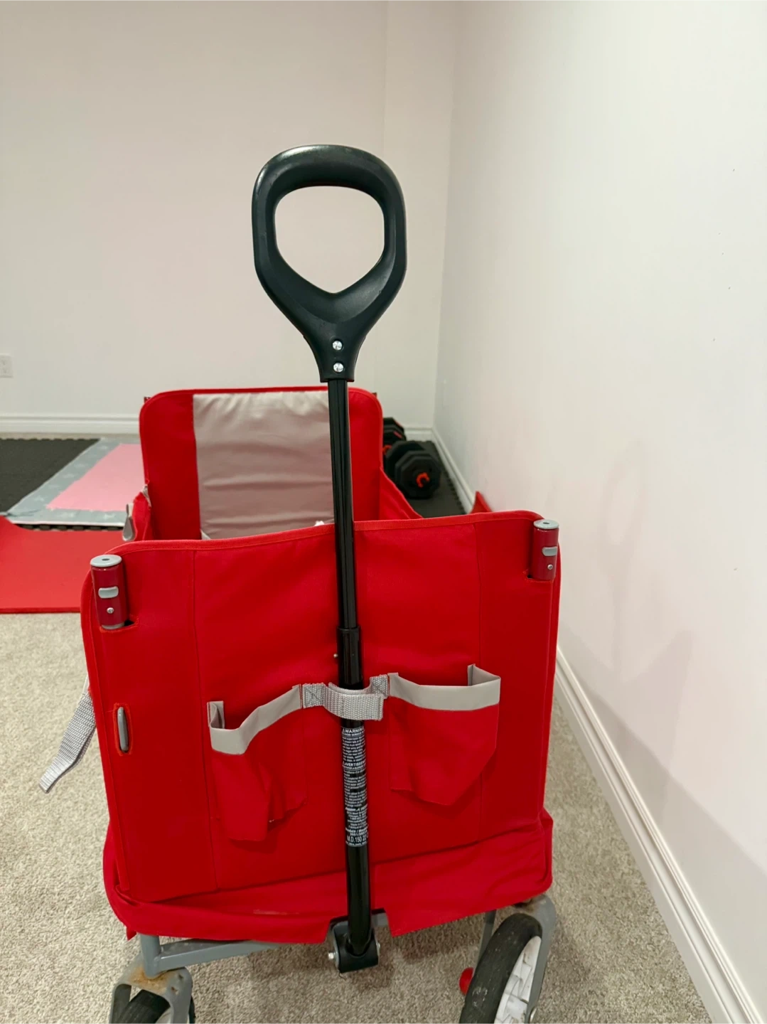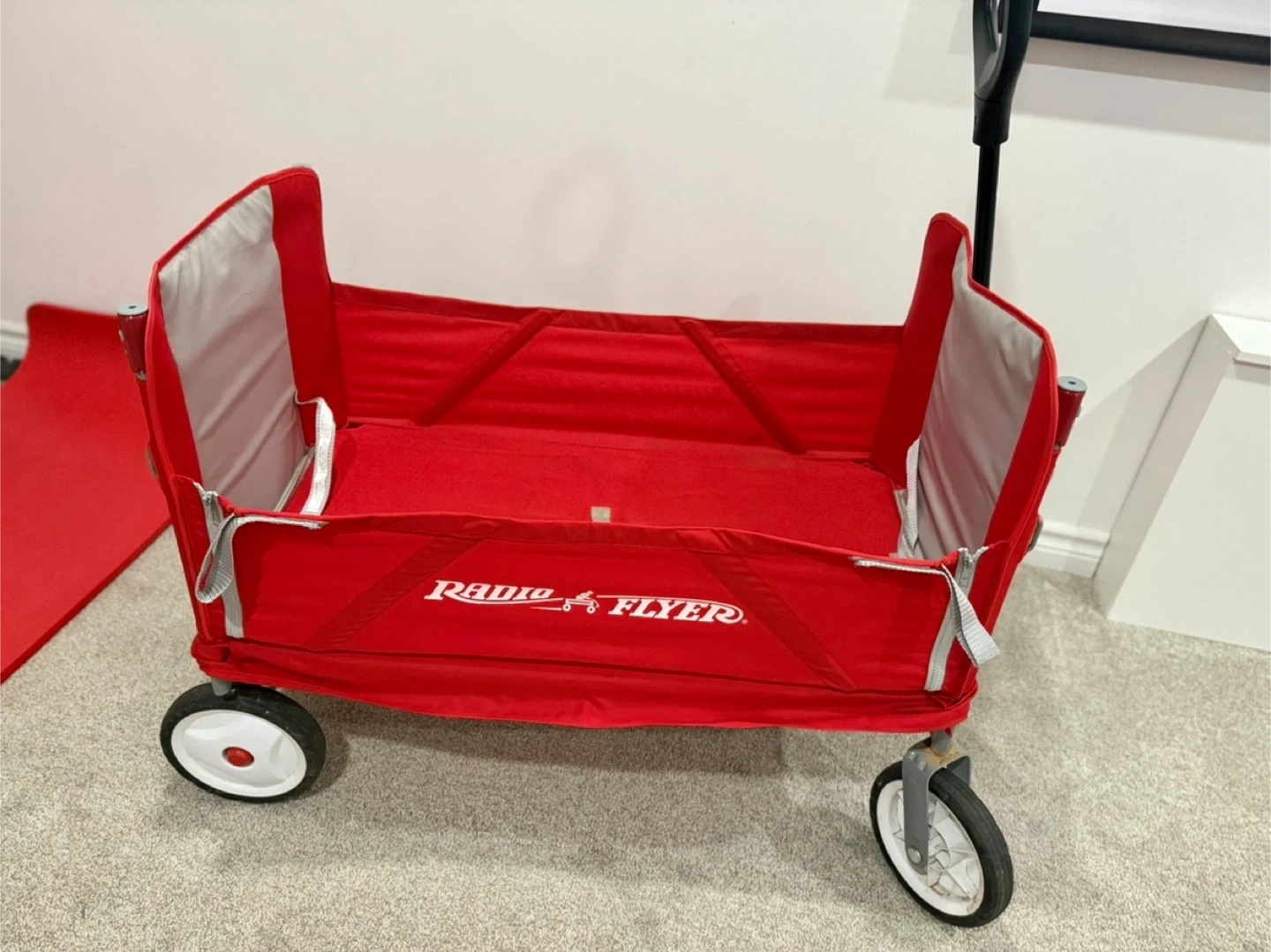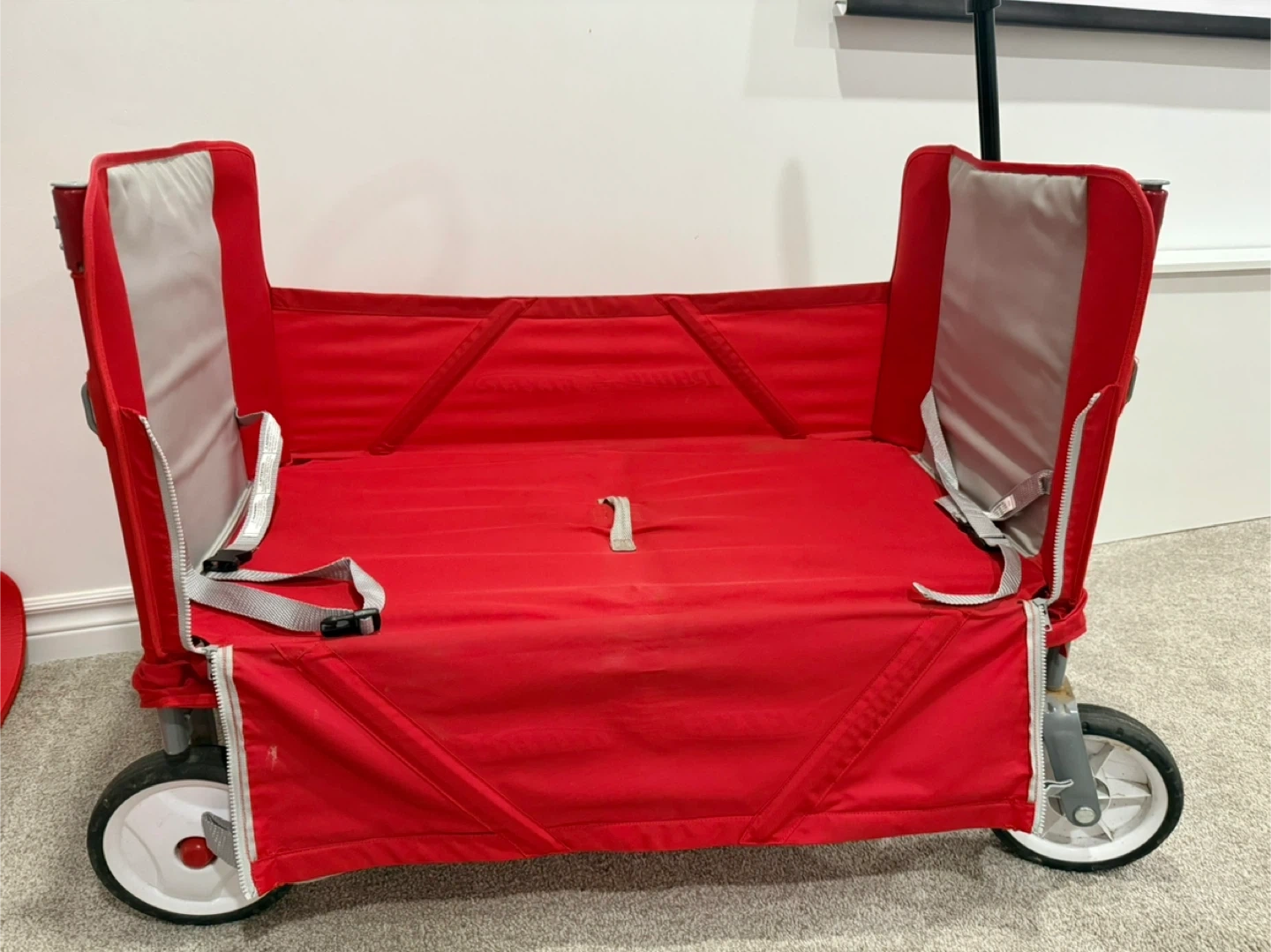 Gently used and in excellent condition This versatile collapsible wagon has 3 riding features: 1. Hauling – carry all your gear with ease; 2. 2 Rider Seating – comfortable space for kids; 3. Bench Seating – unzip the sides to instantly create a bench. ✅ Easy one-hand fold for quick storage and portability ✅ Canopy for shade and protection ✅ Strong, durable, and perfect for family outings, park trips, or travel Used but very well kept.