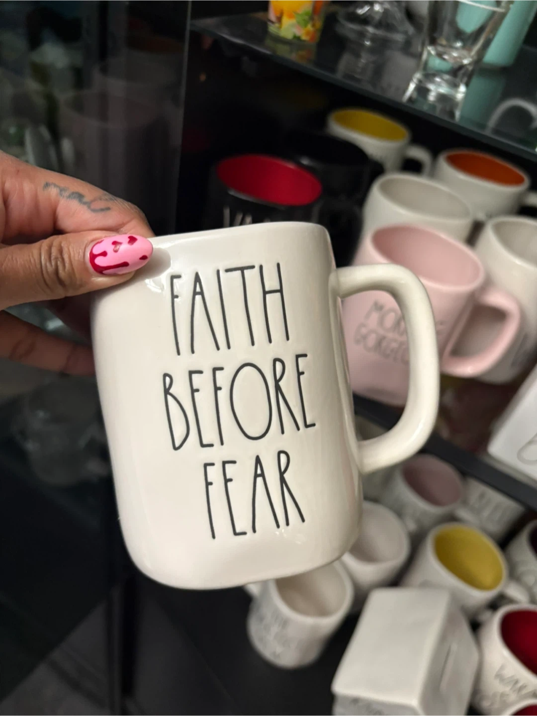 Selling a Rae Dunn mug with 'Faith Before Fear' written on it. It's in great shape and ready for a new home! Perfect for your morning coffee or tea