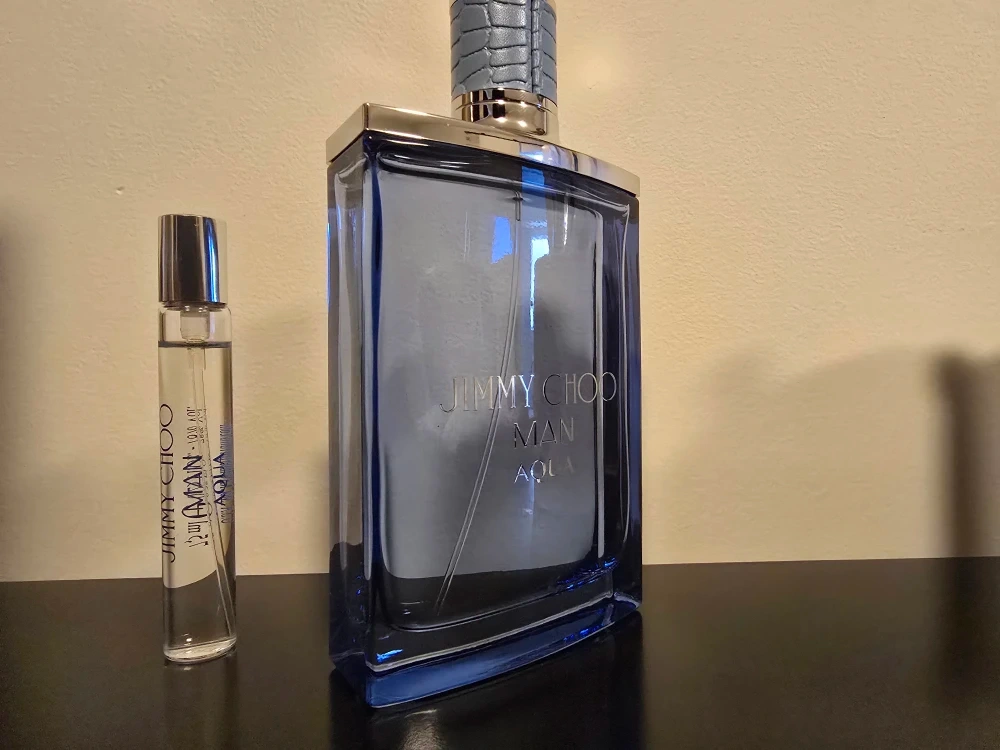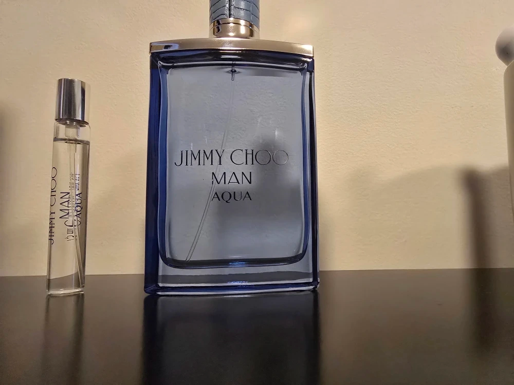 This is a Jimmy Choo Man Aqua Eau de Toilette set. It includes a large bottle and a travel-sized atomizer. The fragrance is aquatic and fresh.