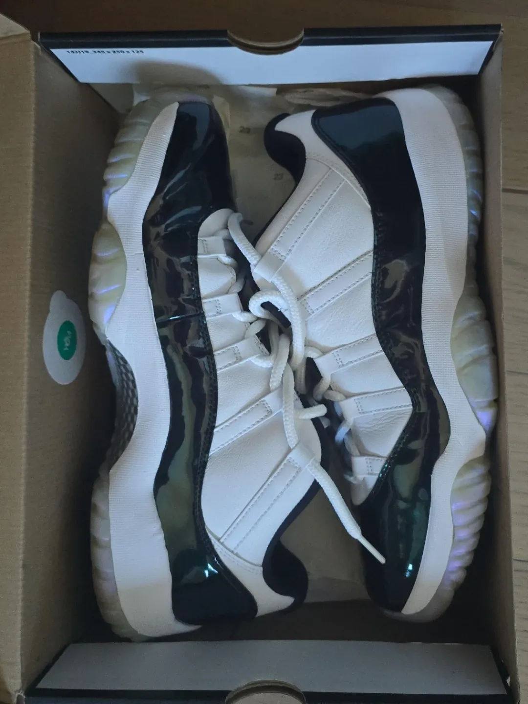 These Air Jordan 11 Retro Low sneakers feature a white leather upper with black patent leather accents. They include white laces and a translucent outsole. Comes with original box.