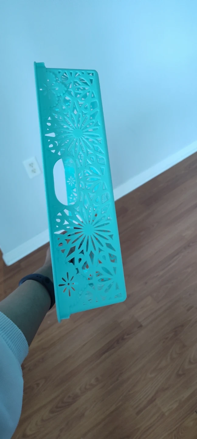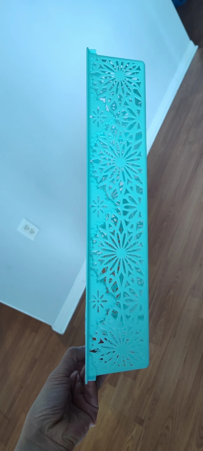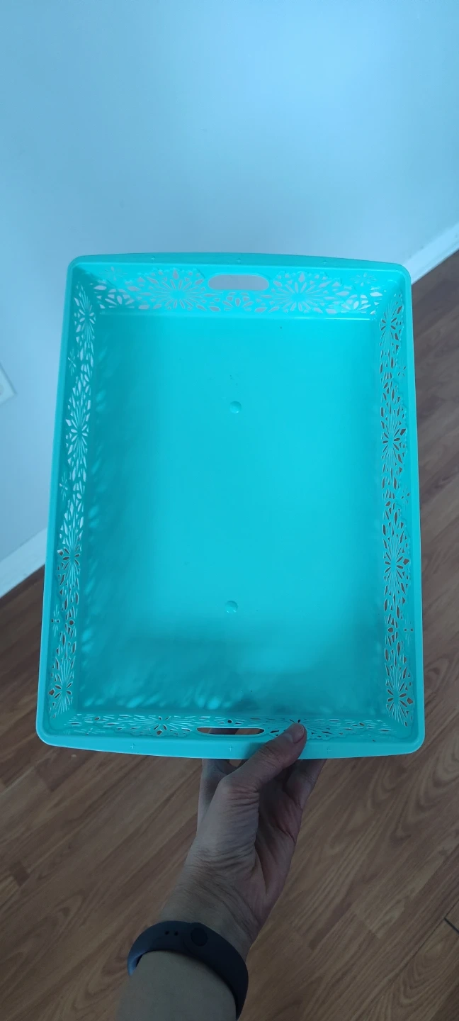 Two decorative storage baskets with cutout snowflake design. It has built-in handles for easy carrying. Plastic material.