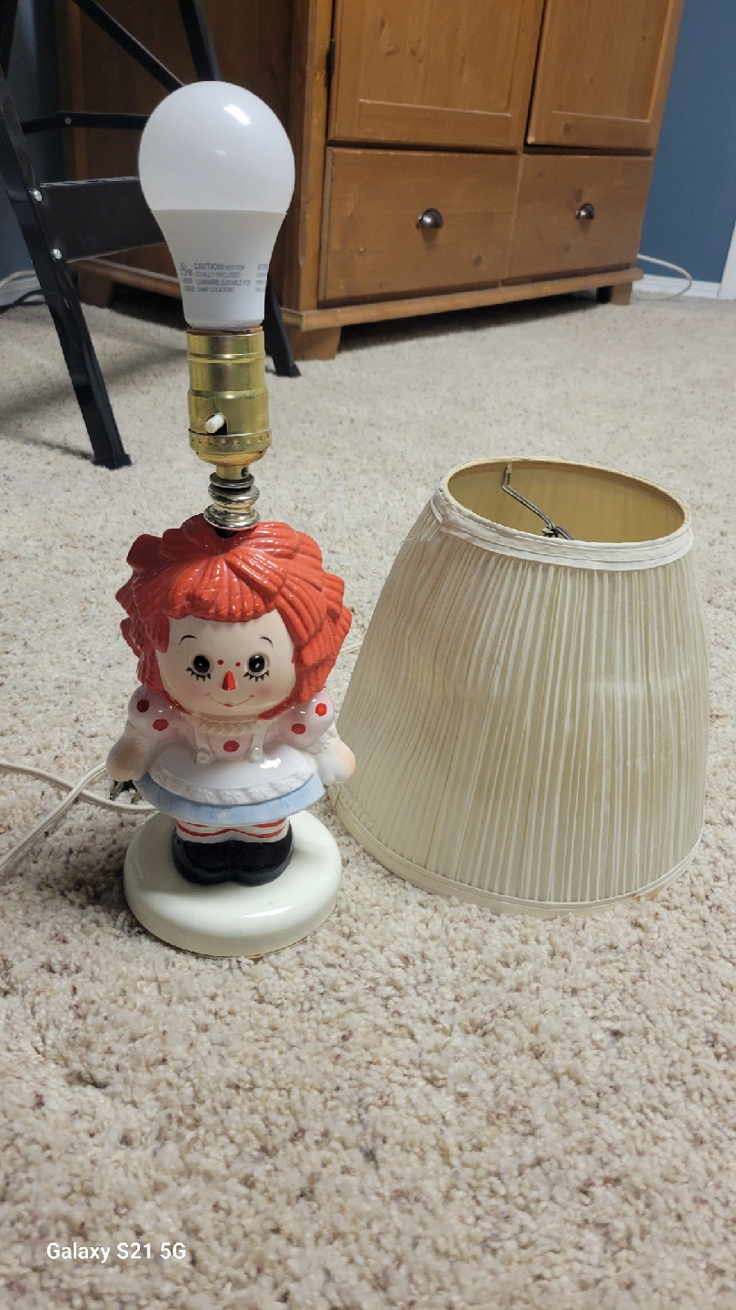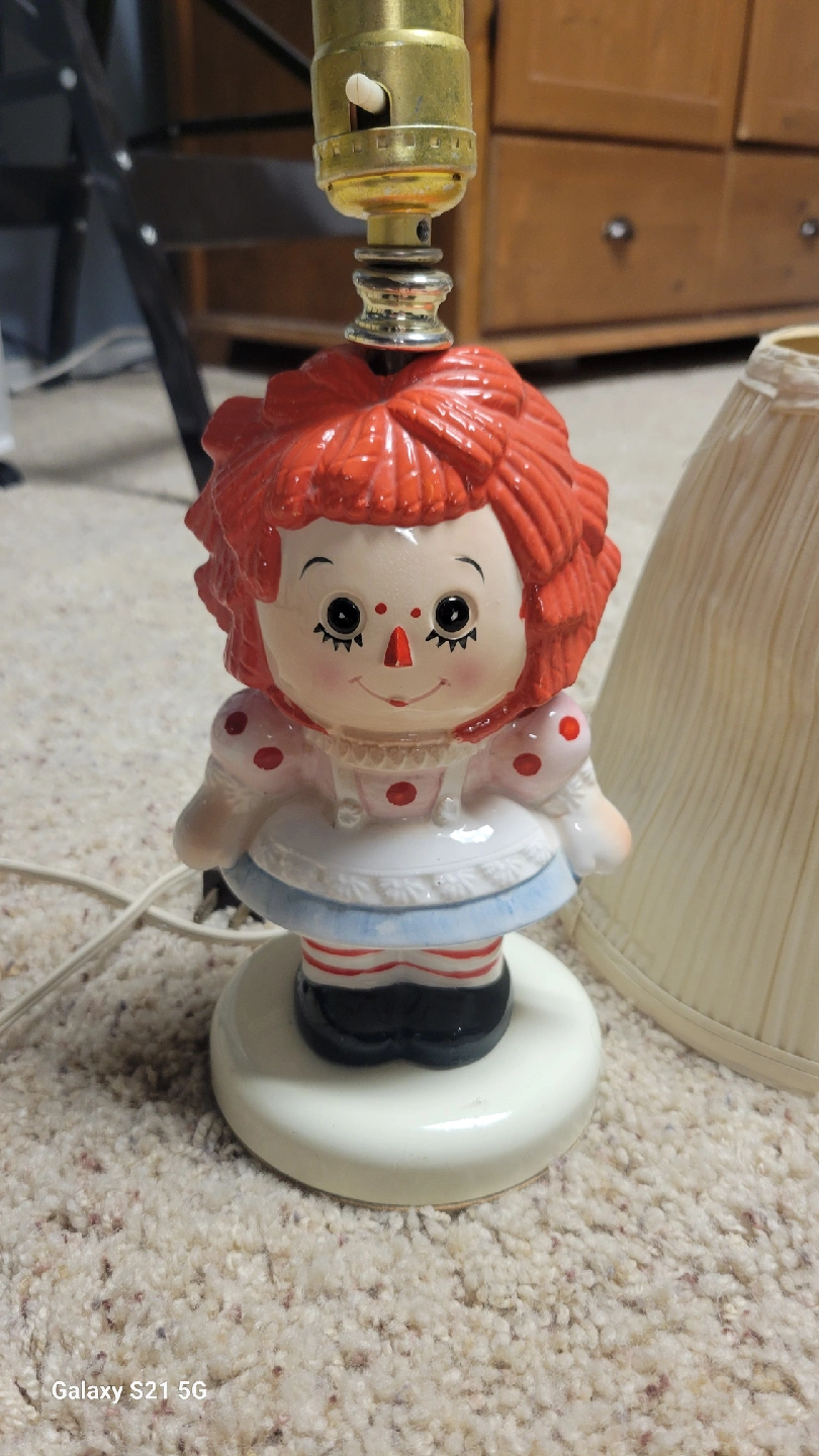 25Here's a cute Raggedy Ann lamp for sale! The lampshade is included, but it has a small tear on the inside. Otherwise, it's in good condition and ready to brighten up a room. Good working order