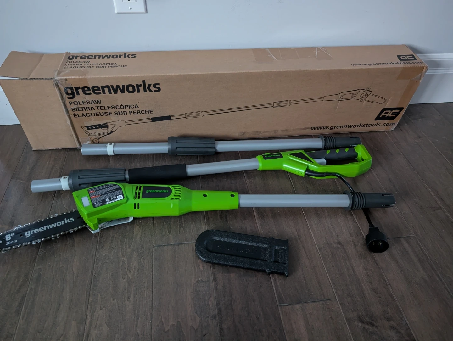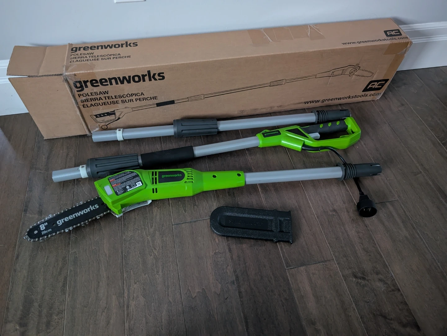 Like new Greenworks mini chainsaw pole saw for sale. Corded, auto oil, 8” inch blade, 6.5Amp powerful motor, up to 8’ feet aluminum shaft extension. $75 FIRM.