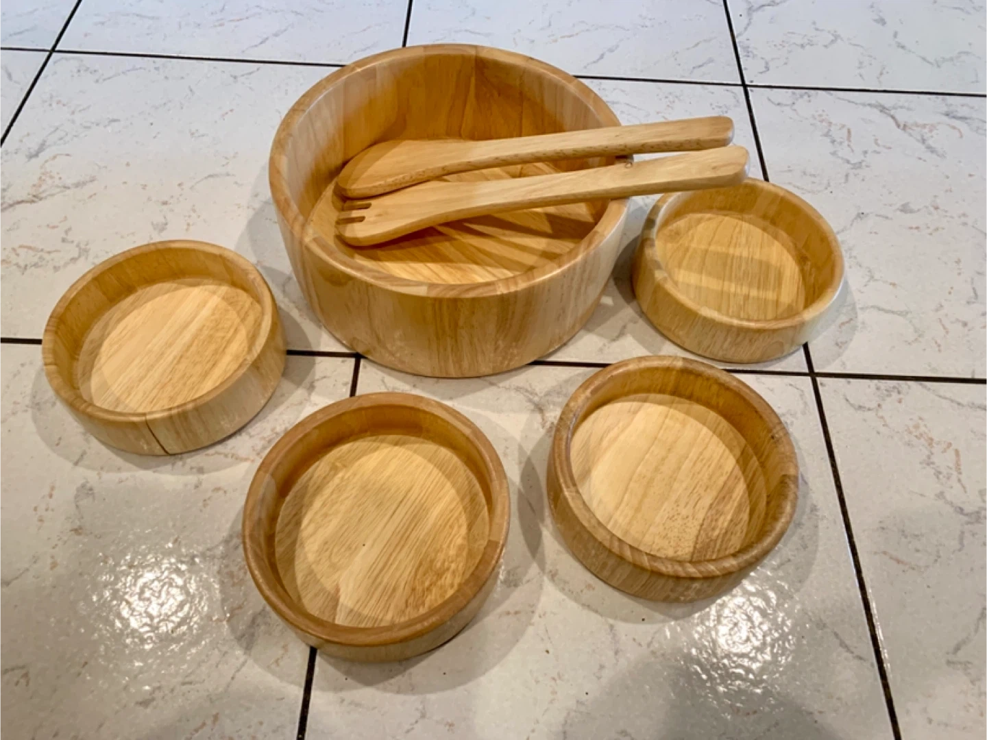 This natural wood salad bowl set includes one large bowl and four smaller individual bowls. It also comes with a salad fork and spoon for serving. Perfect for family gatherings or everyday use!