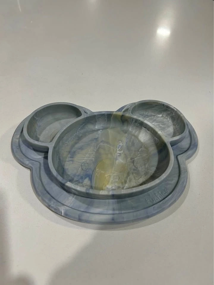 Kushies Baby SiliPlate Silicone Divided Plate with Suction Base in a unique marble-look "Marble Grey/Sand" swirl finish (less common). Grey/cream marbled pattern, see photos. Made from food-grade silicone (BPA/PVC/phthalate free). Features a suction base that adheres to most flat surfaces, and three divided sections for self-feeding. Freezer, microwave, oven & dishwasher safe. Like-new condition. Located in New Westminster. Pick-up only. $5.