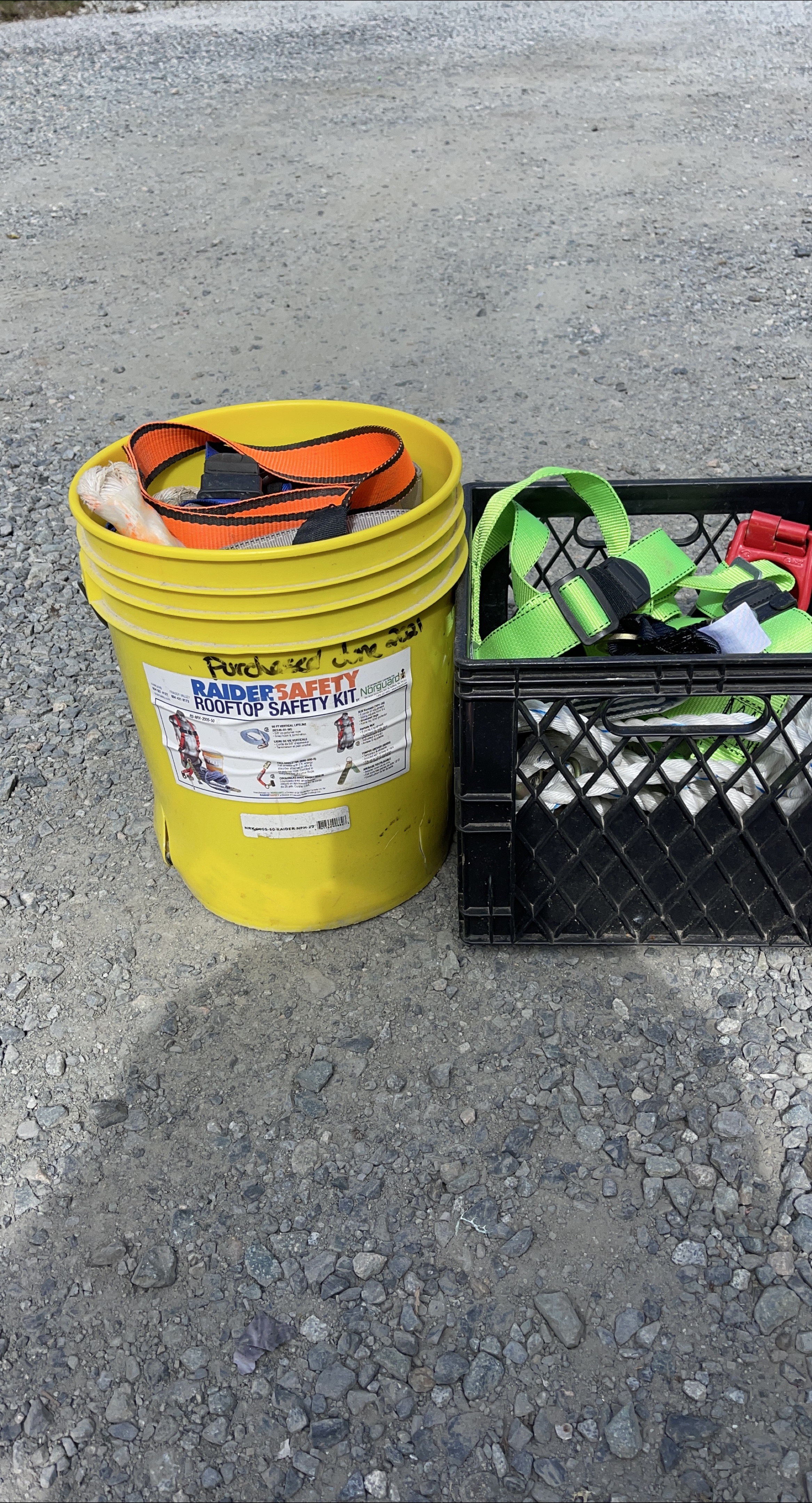Selling a Raider Safety Rooftop Safety Kit. It includes a bucket and various safety straps and ropes. Perfect for anyone needing rooftop safety equipment!