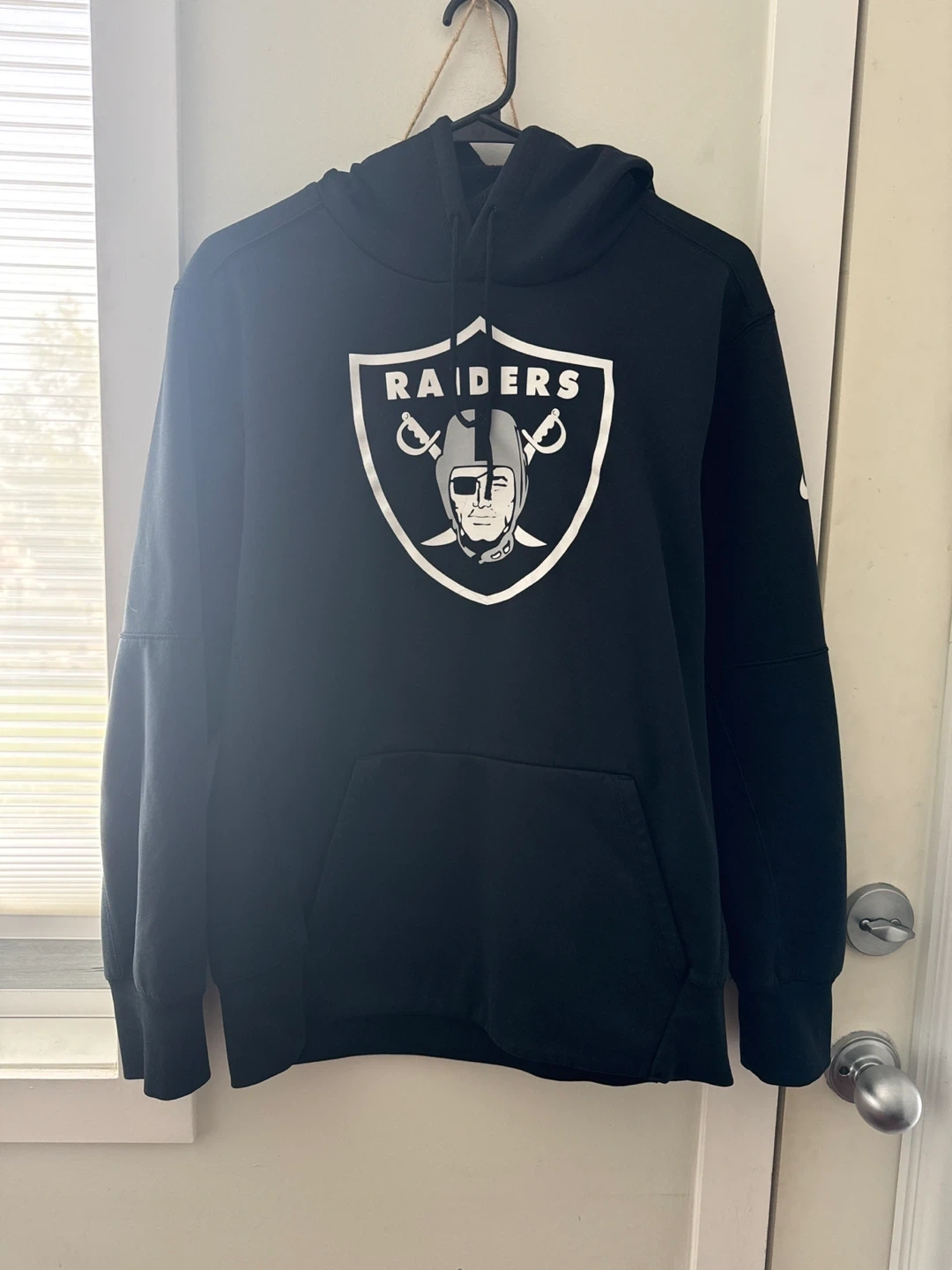 Selling a Raiders hoodie in black! It's in great condition and features the iconic Raiders logo on the front. Perfect for any fan! Medium Size. I bought for $80.