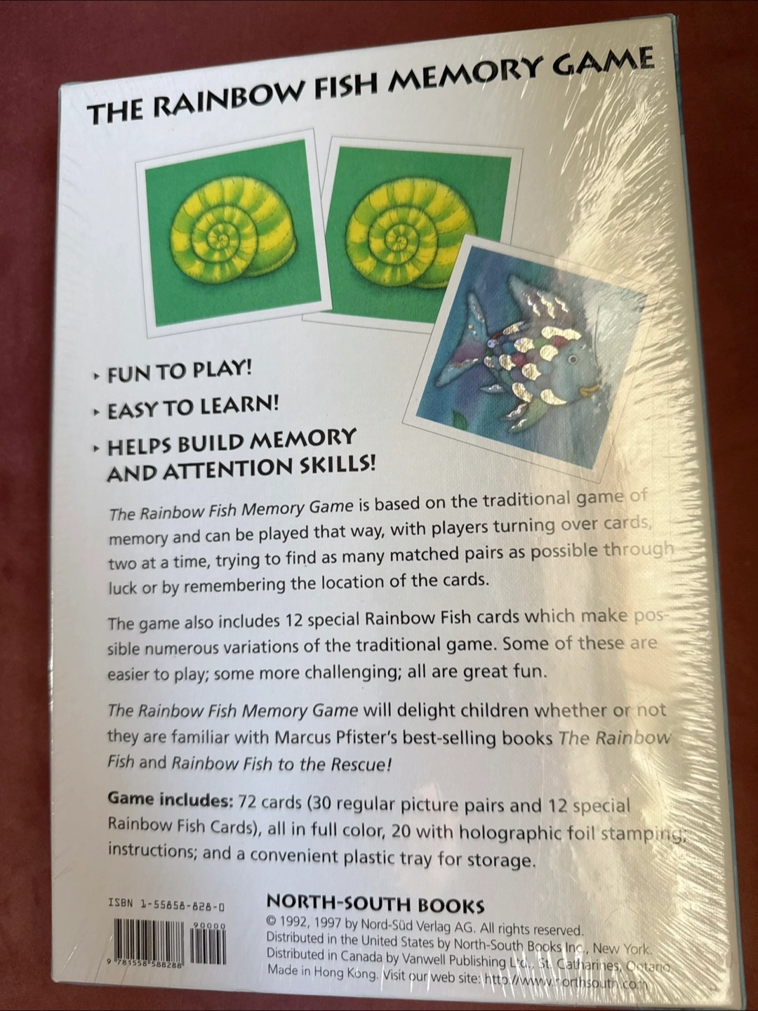 120Selling a brand new, sealed Rainbow Fish Memory Game! This fun and easy-to-play game helps build memory and attention skills. It includes 72 cards (30 regular picture pairs and 12 special Rainbow Fish Cards), all in full colour, with holographic foil stamping, instructions. I live in Markham and ONLY can meet you at these locations in Markham: Petro Canada Gas station: corner of 16 ave and 9th line 9259 Ninth Line Or Shoppers drug mart of Hwy7/Wooten way 6579 Highway 7 East, Markham