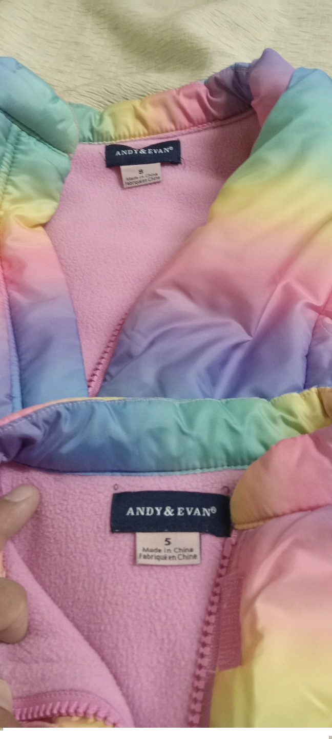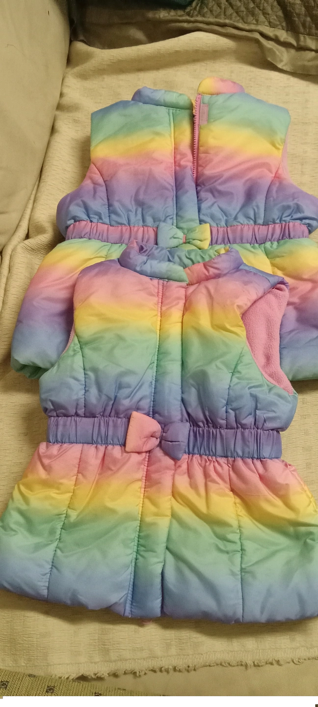 Adorable girls' outerwear set. Includes a rainbow puffer vest and matching jacket. Size 5. Great for layering during colder months. Both pieces feature a pink fleece lining. one is size 5 and one is size 8 price is firm for both jackets