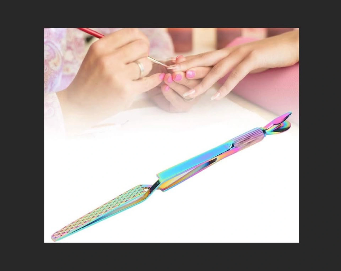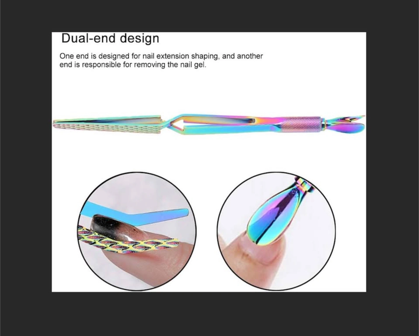 This is a dual-end design nail art tool. One end is designed for nail extension shaping, and another end is responsible for removing the nail gel