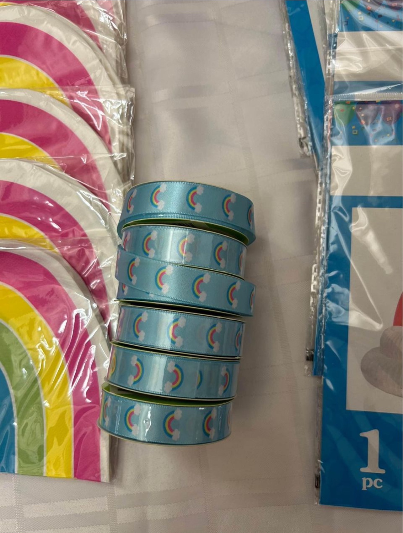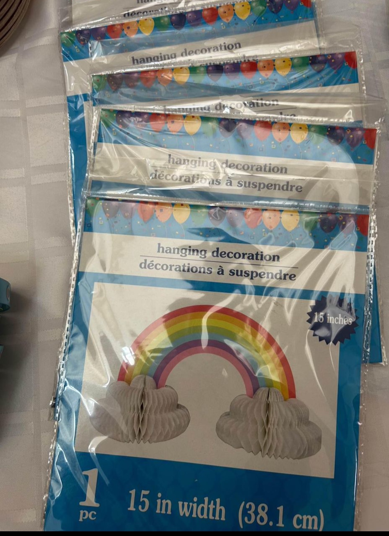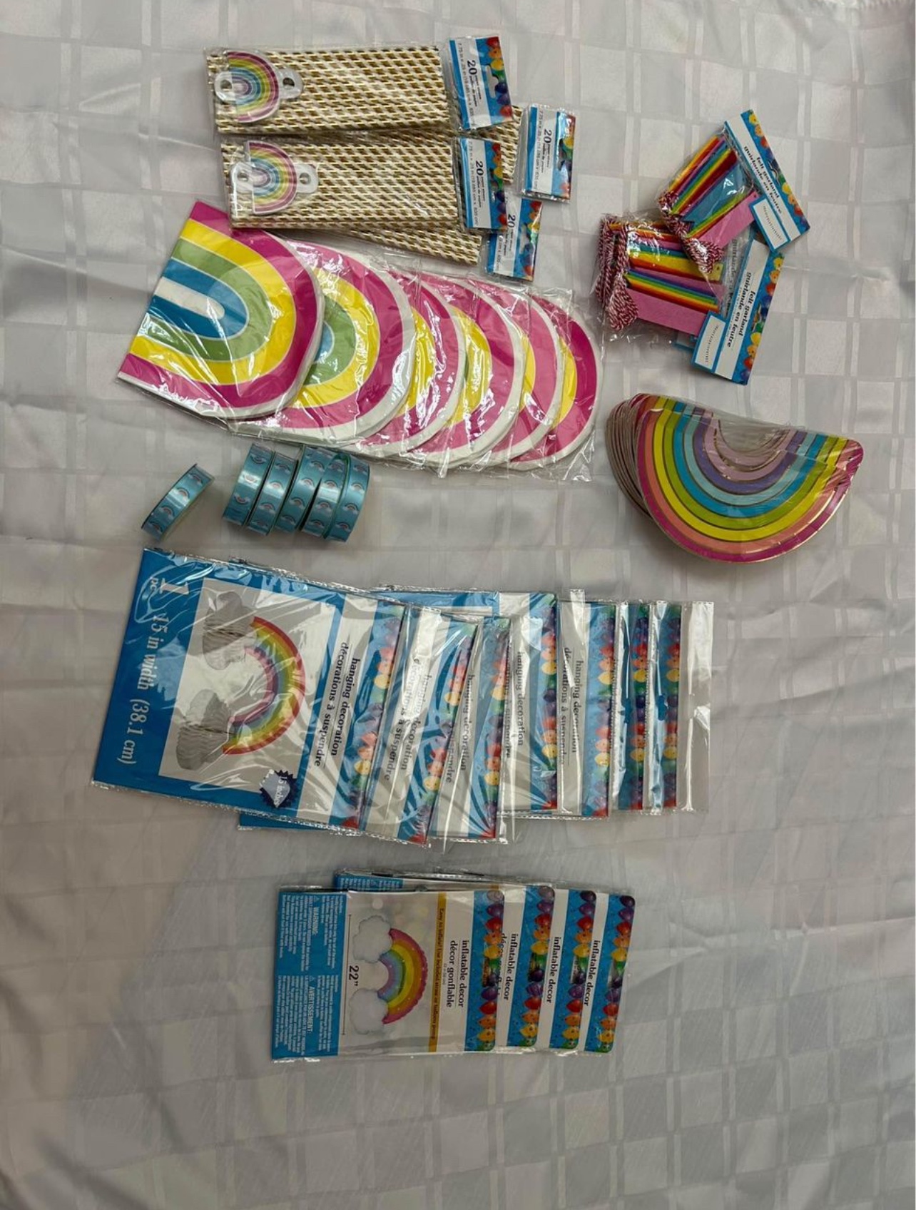 5BRAND NEW PARTY SUPPLIES RAINBOW THEME $40 takes all ( if bought from dollar store all of it would be $66) 120 rainbow shaped plates - could be put on a stick or hung mobile style or put on the wall they can be used in other ways for fun decor besides just as a plate 84 Rainbow napkins 7 rainbow hanging decoration with honey comb clouds 80 gold stripped paper straws with paper rainbow embellishments again can use in fun different ways for decor besides just as straws 4 felt rainbow garlands 18 yards( 16.44meters) blue rainbow ribbon Would like to sell it all together 5 Mylar rainbow balloons @22” in size each CASH ONLY