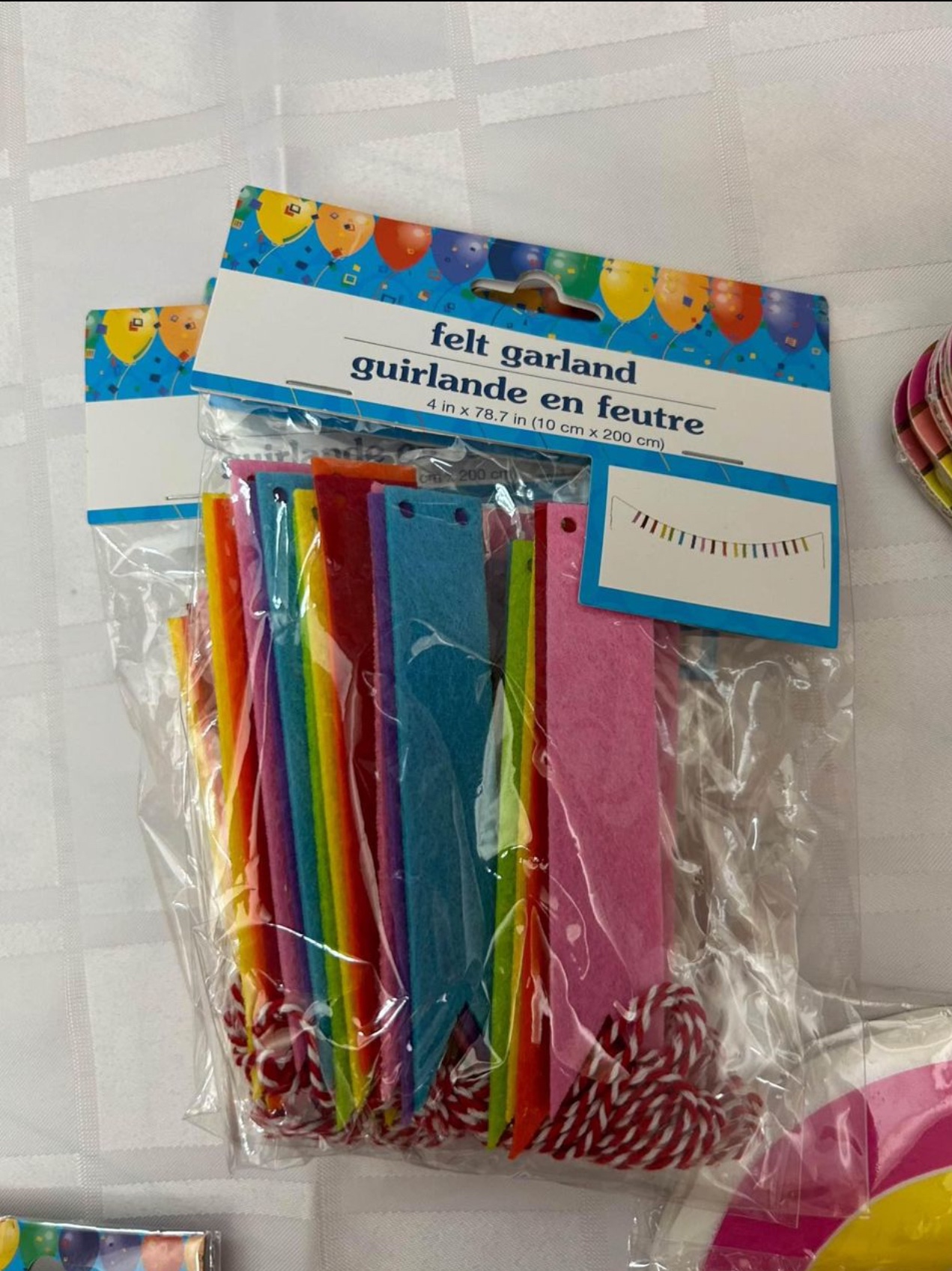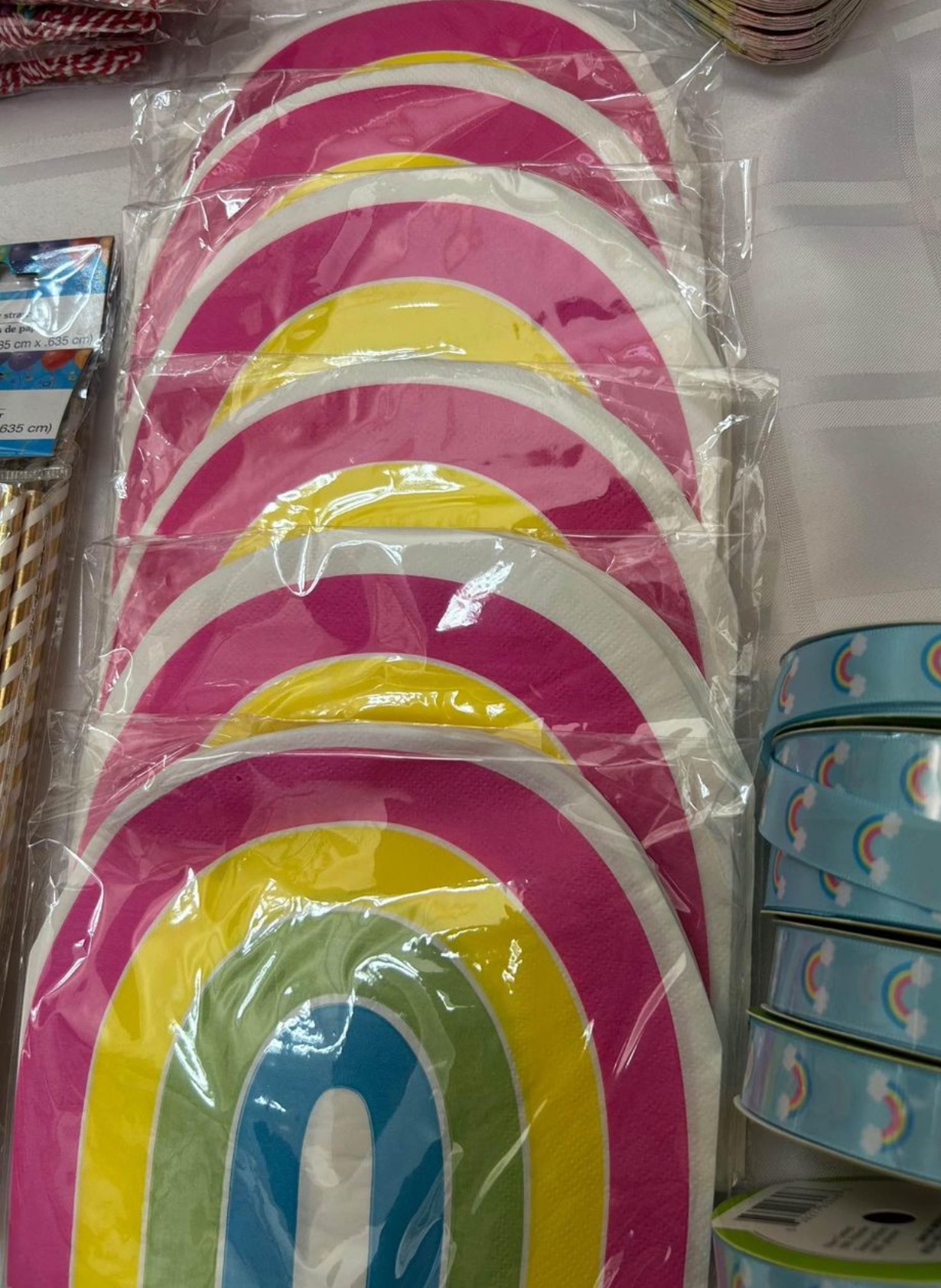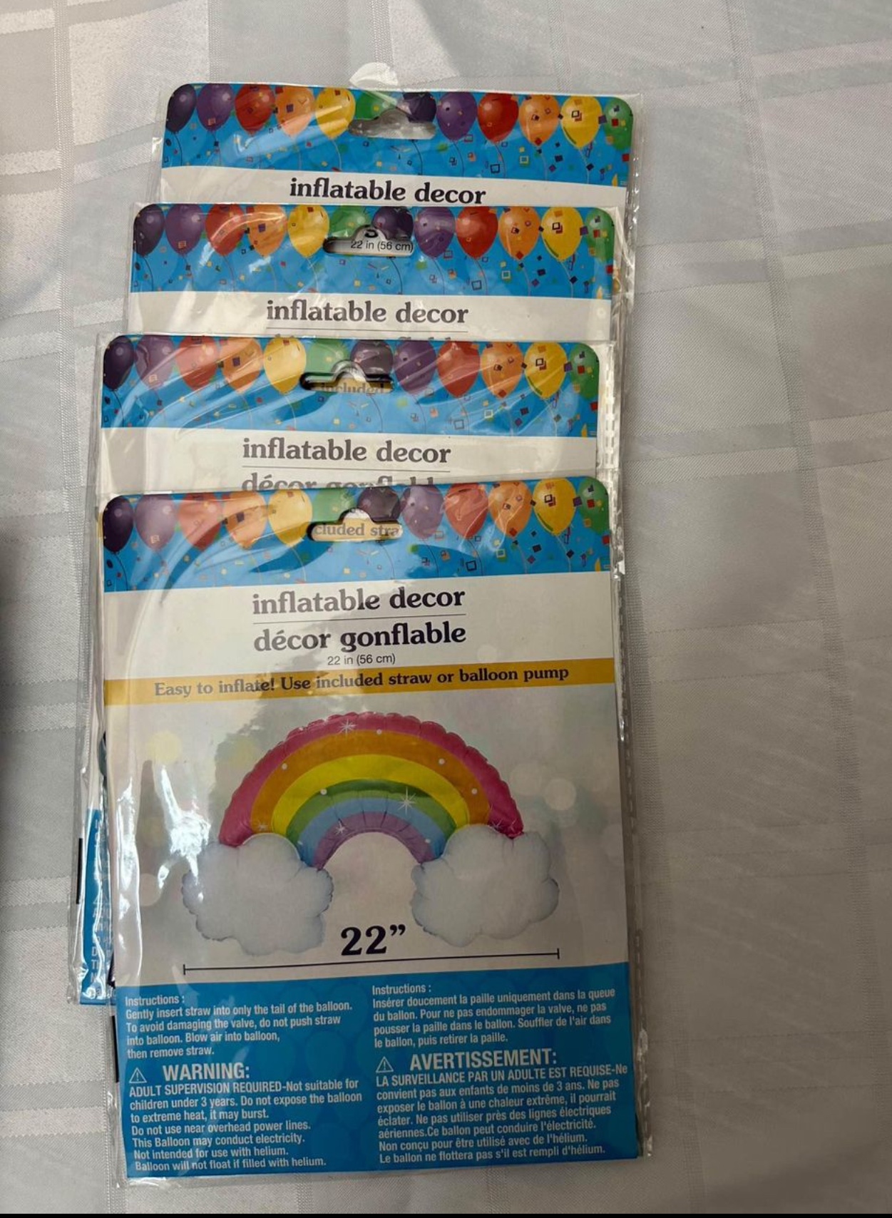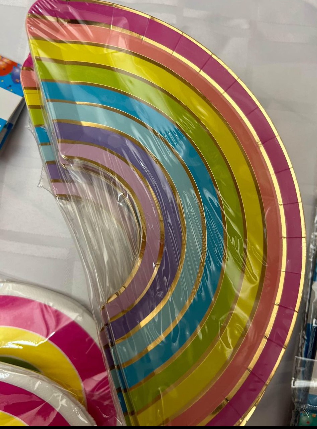 5BRAND NEW PARTY SUPPLIES RAINBOW THEME $40 takes all ( if bought from dollar store all of it would be $66) 120 rainbow shaped plates - could be put on a stick or hung mobile style or put on the wall they can be used in other ways for fun decor besides just as a plate 84 Rainbow napkins 7 rainbow hanging decoration with honey comb clouds 80 gold stripped paper straws with paper rainbow embellishments again can use in fun different ways for decor besides just as straws 4 felt rainbow garlands 18 yards( 16.44meters) blue rainbow ribbon Would like to sell it all together 5 Mylar rainbow balloons @22” in size each CASH ONLY