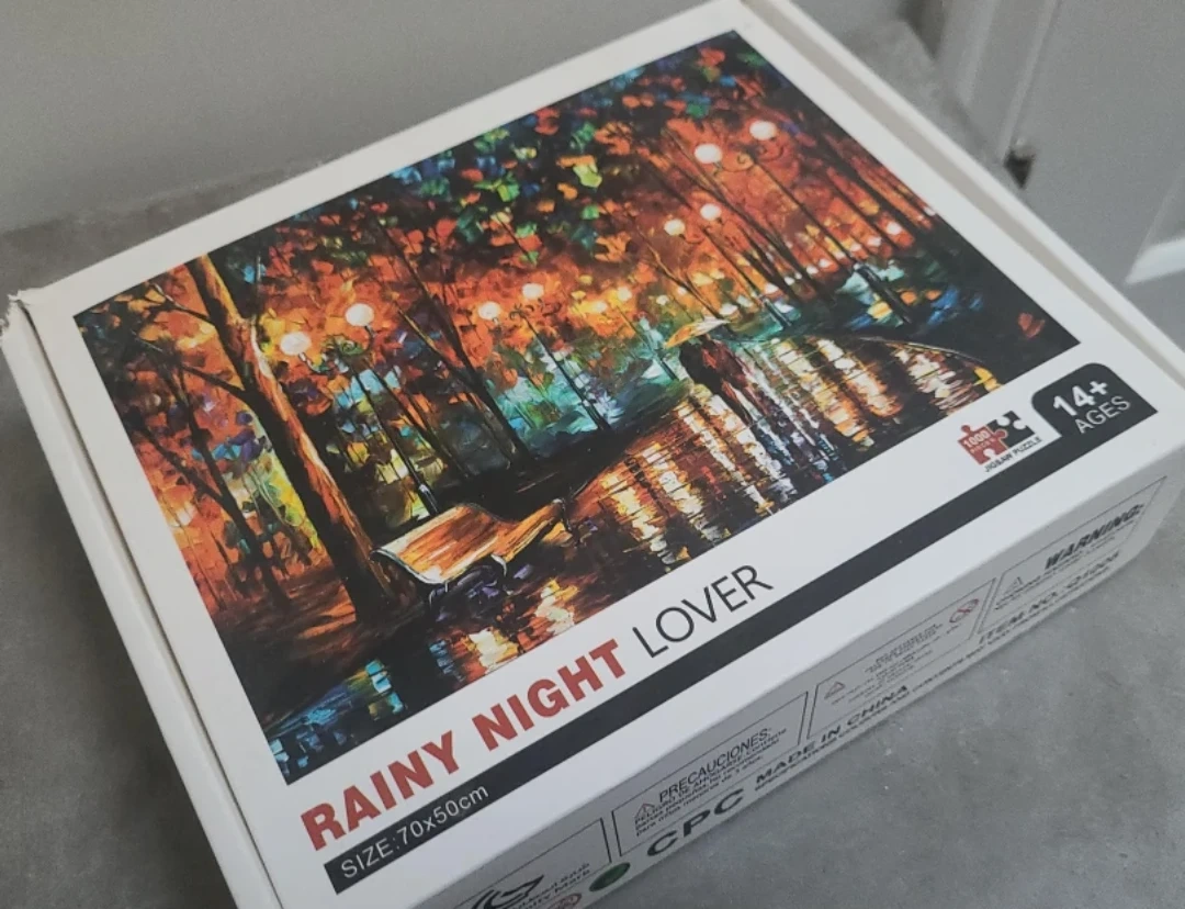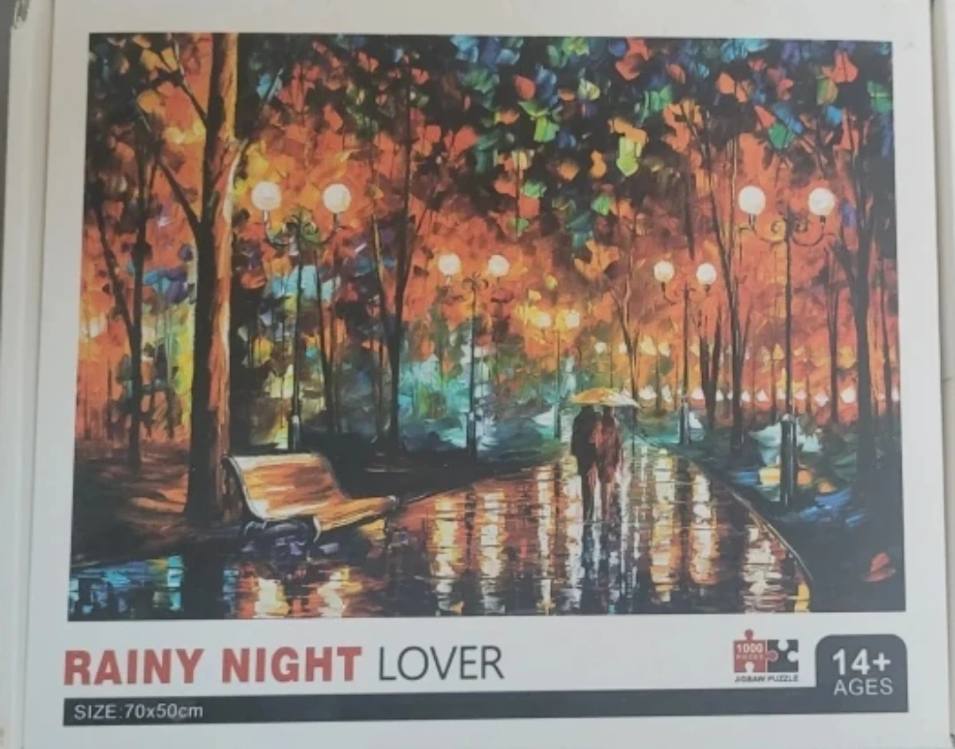 15Selling a 'Rainy Night Lover' jigsaw puzzle! It has 1000 pieces and is recommended for ages 14+. The size of the finished puzzle is 70x50cm. It's a beautiful image when completed!