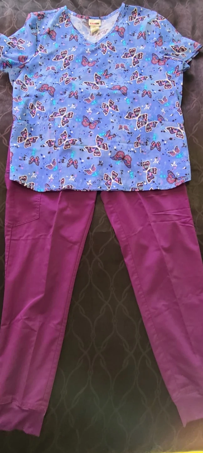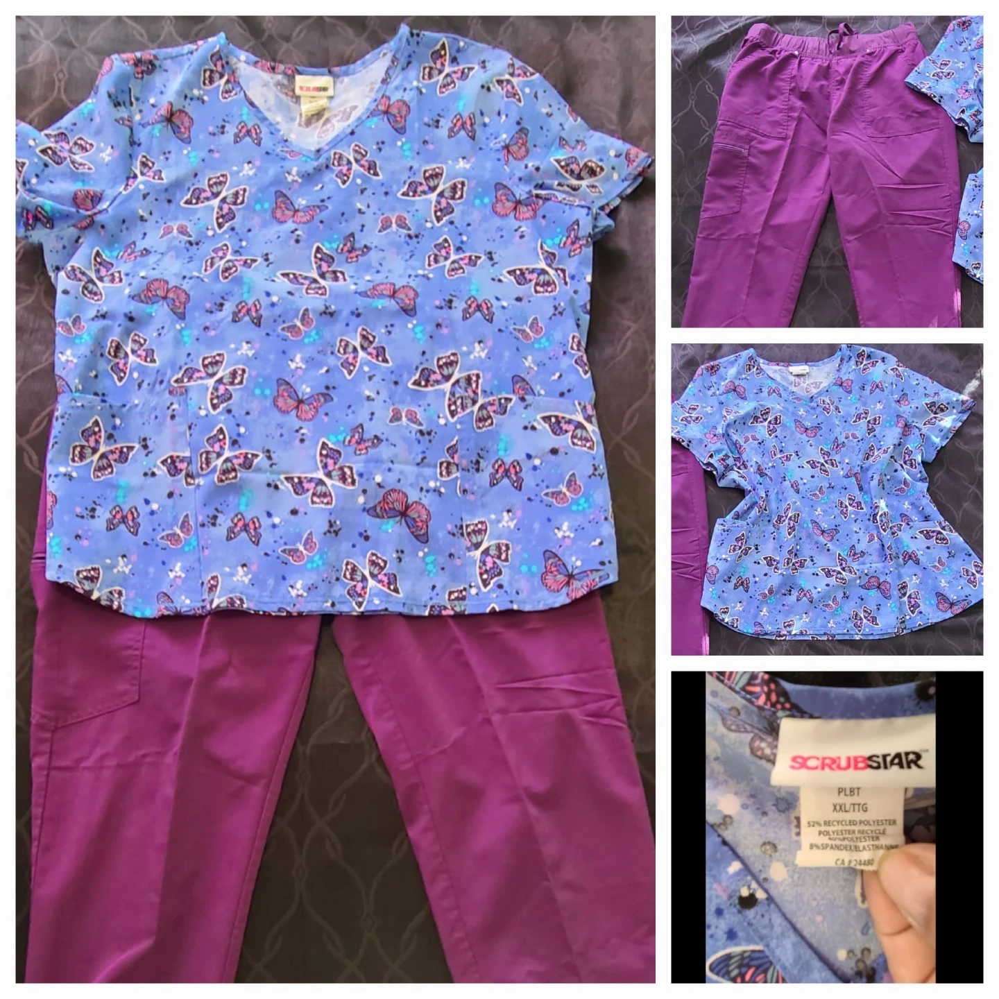 This is a Scrubstar scrub top and pant set featuring a fun butterfly print. The top is light blue with purple and pink butterflies. The pants are a solid deep purple. Top is a size XXL pant is a L. The material is a blend of recycled polyester and spandex.