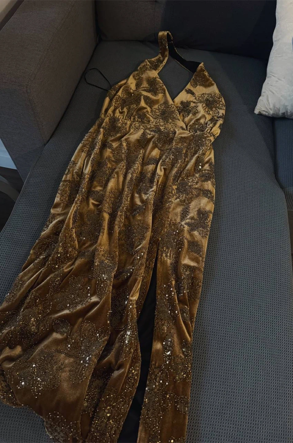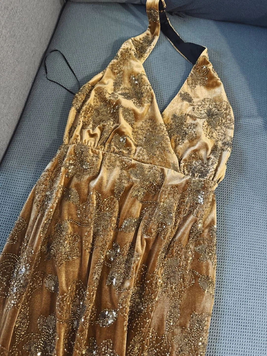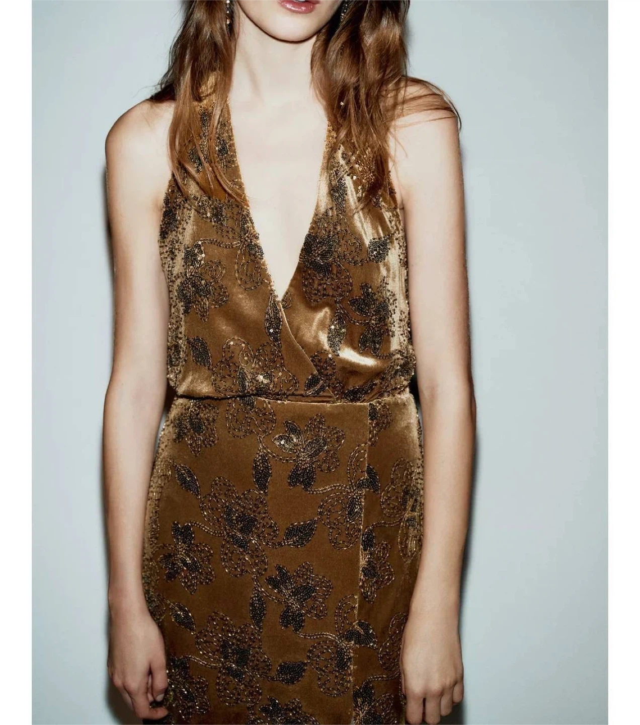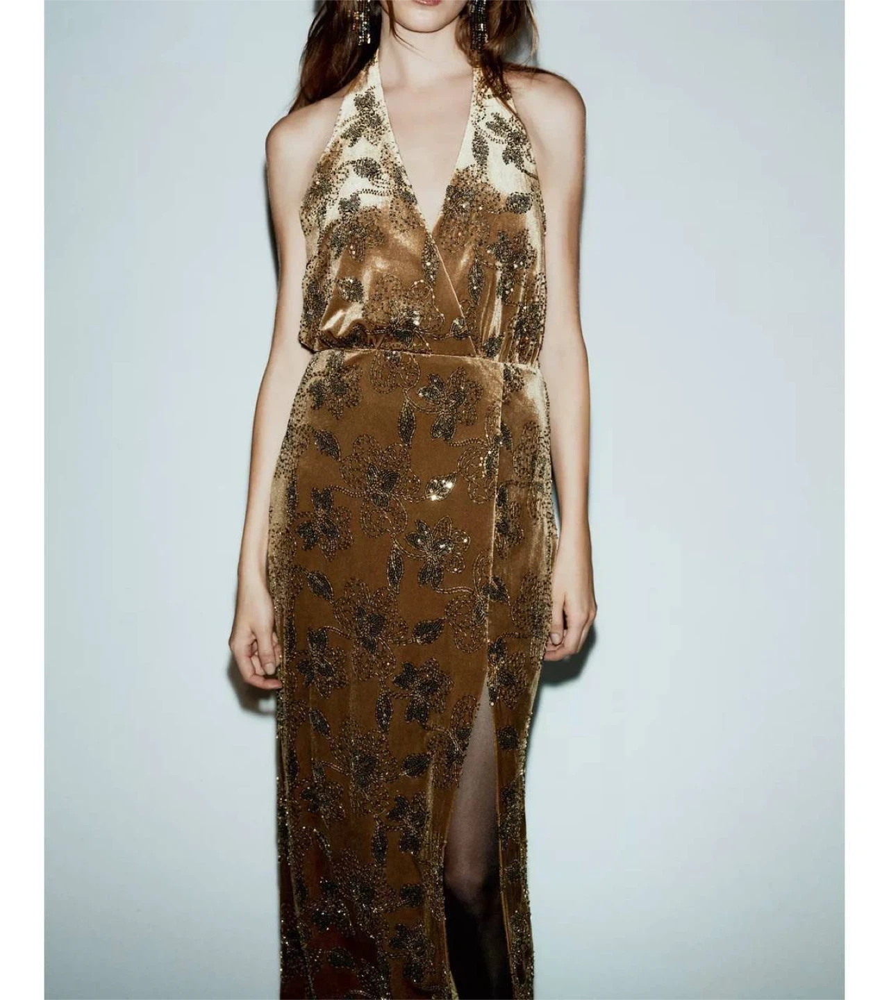 Elegant velvet midi dress from ZARA with subtle sequin detailing that adds a soft, luxurious shimmer. The feminine silhouette with a deep neckline and front slit makes it perfect for evenings, parties, or special occasions.