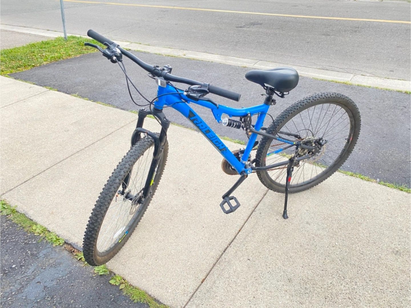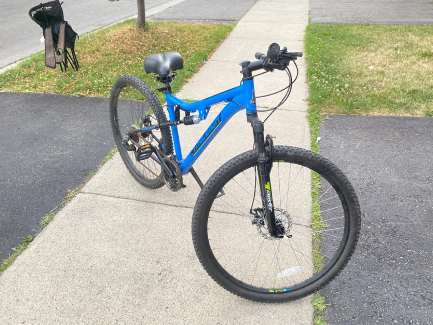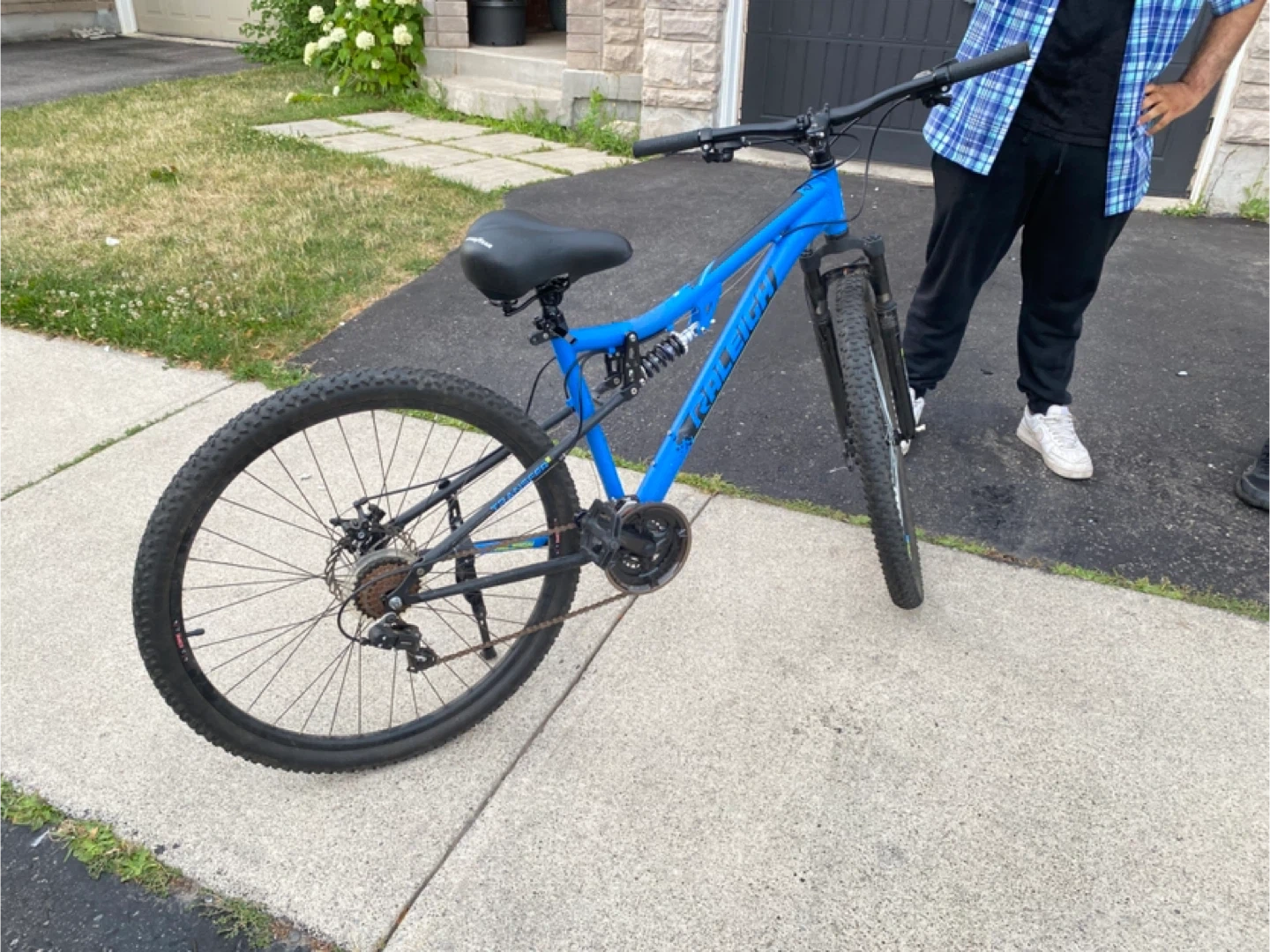 Selling a blue Raleigh mountain bike. It looks like it's in good condition and ready for some trails or city riding! It has front suspension and a comfortable-looking seat. Perfect for someone looking for a reliable bike.
