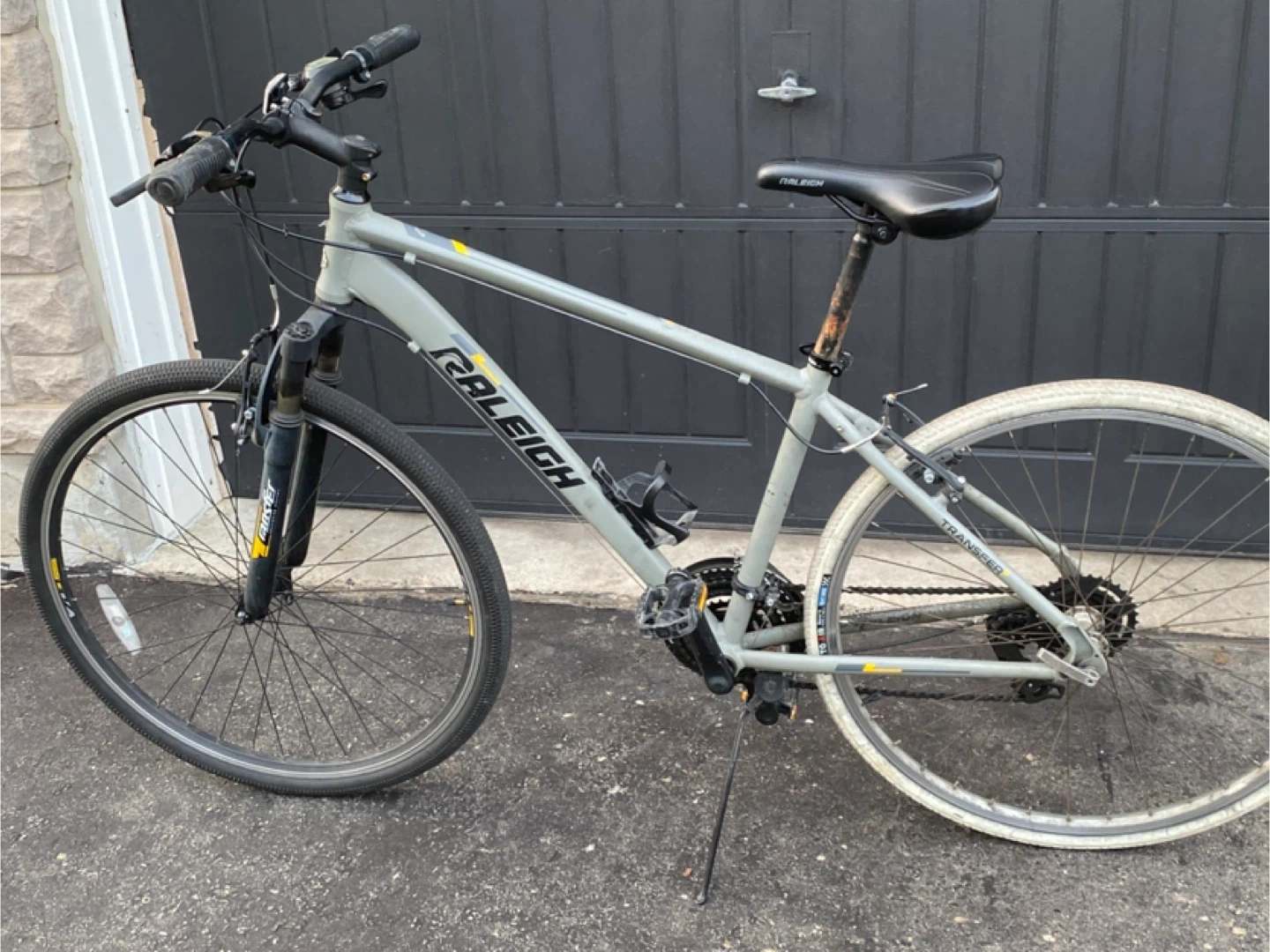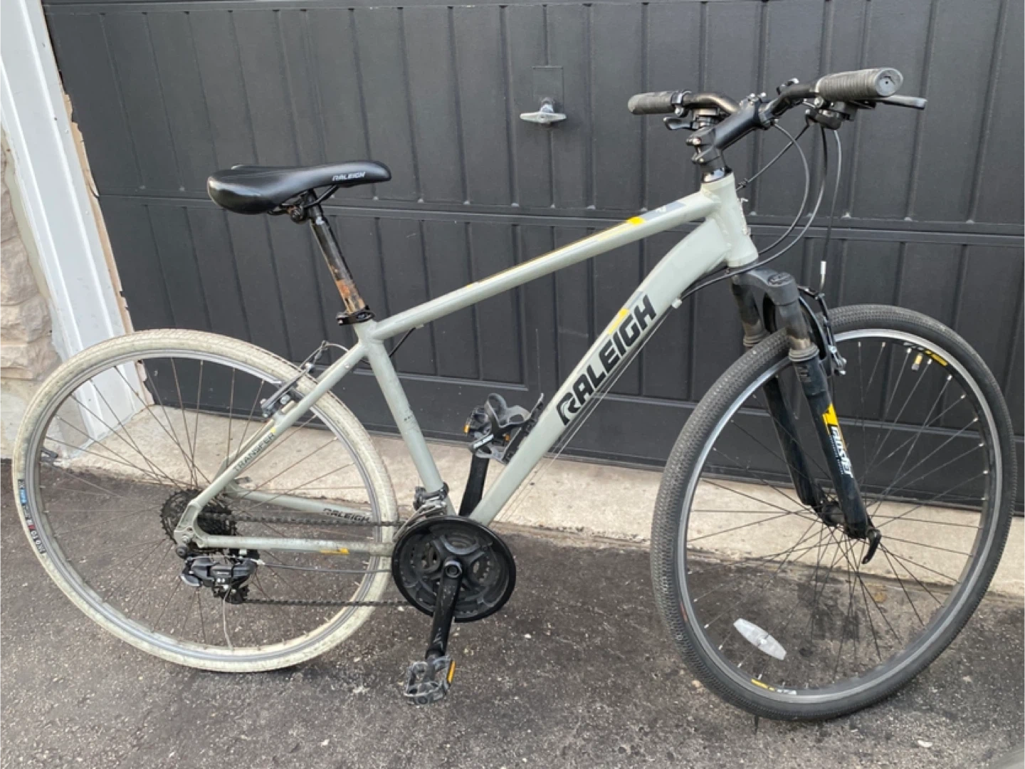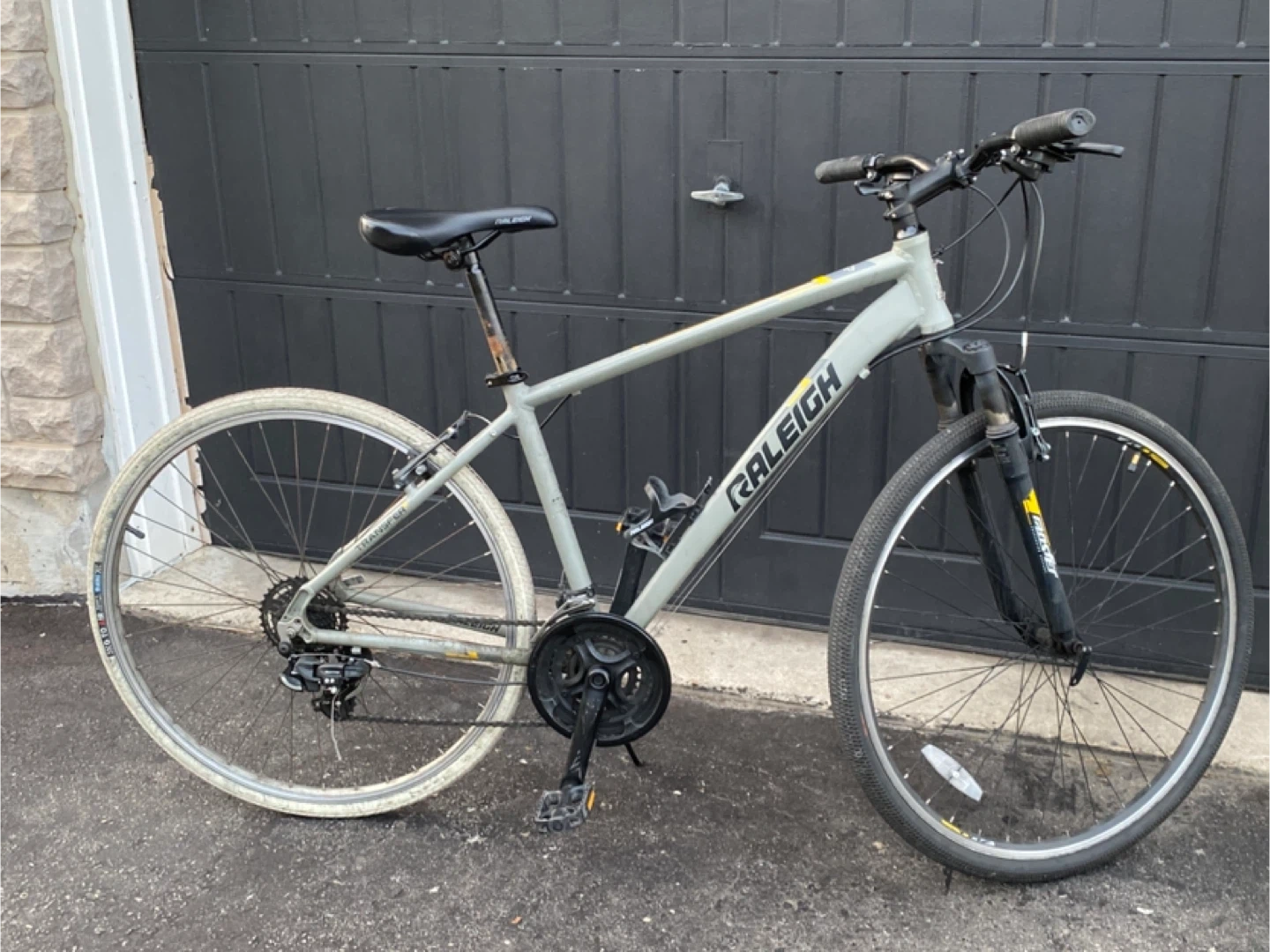 39Raleigh hybrid bike in used condition. Perfect for getting around town or enjoying a leisurely ride on bike paths. It has some signs of wear, but still functions well