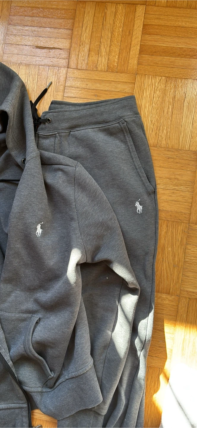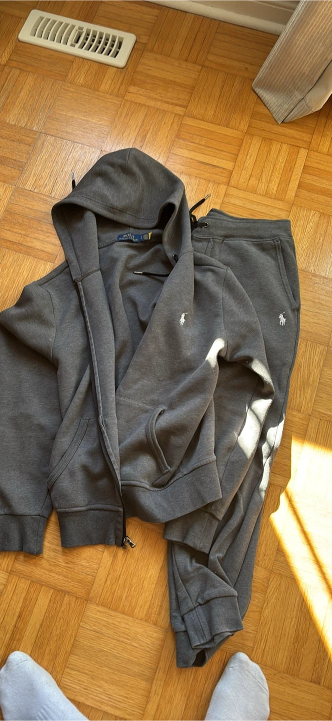 Selling a Ralph Lauren tracksuit in size large! It's a comfy grey colour and includes both the zip-up hoodie and matching pants. The material is soft and in great condition, perfect for lounging or running errands