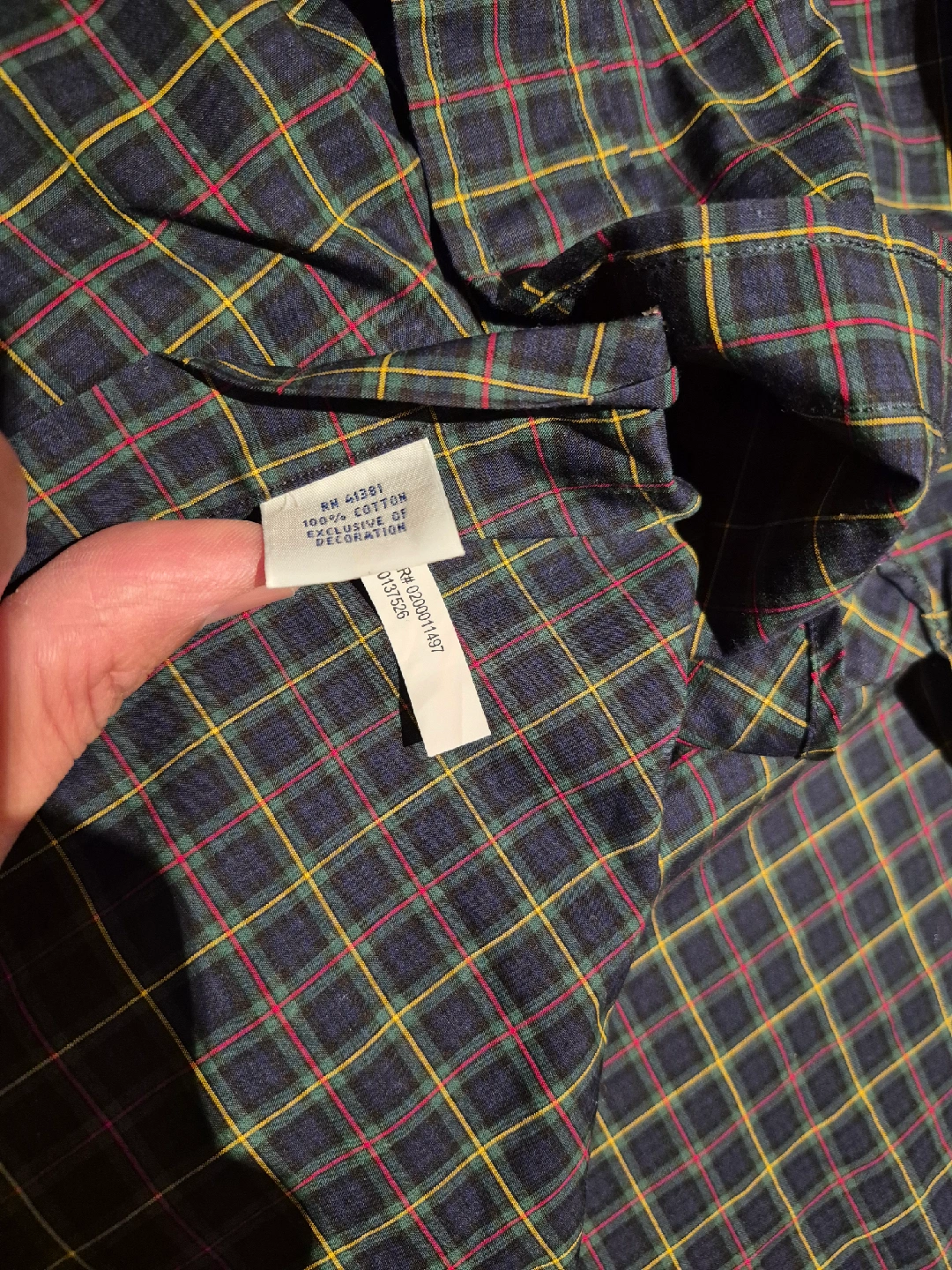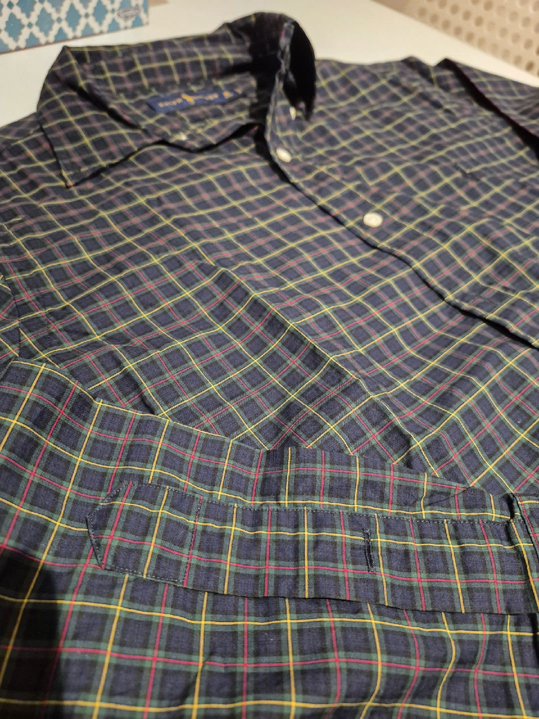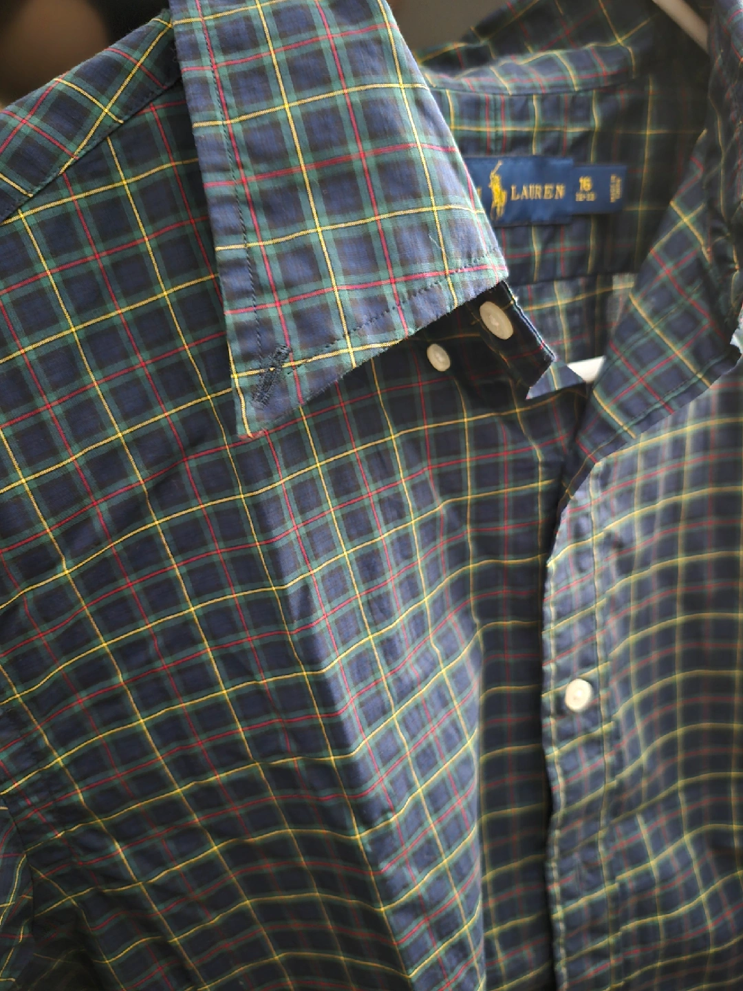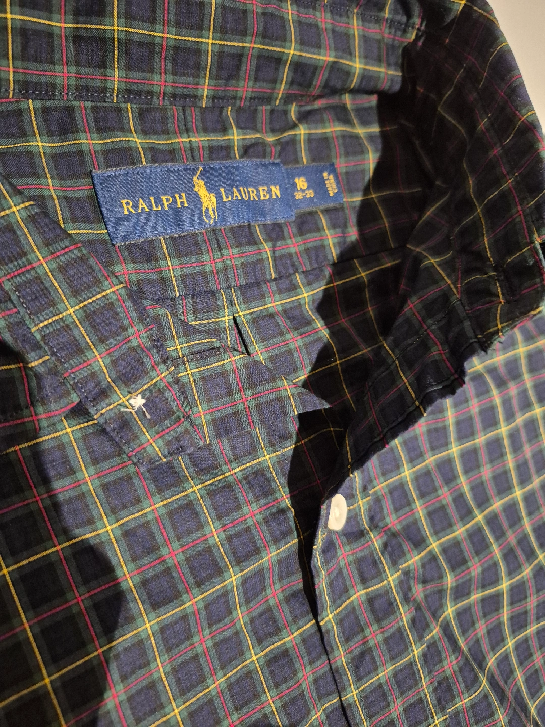 84Classic Ralph Lauren button-down shirt in a timeless plaid pattern! It's a size 16 (Large) and made of 100% cotton. Perfect for a casual or dressed-up look!