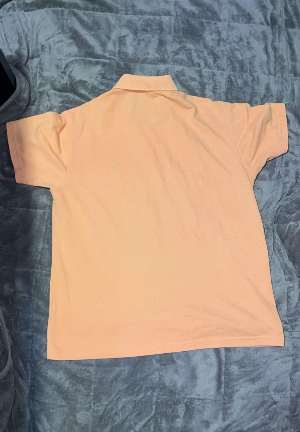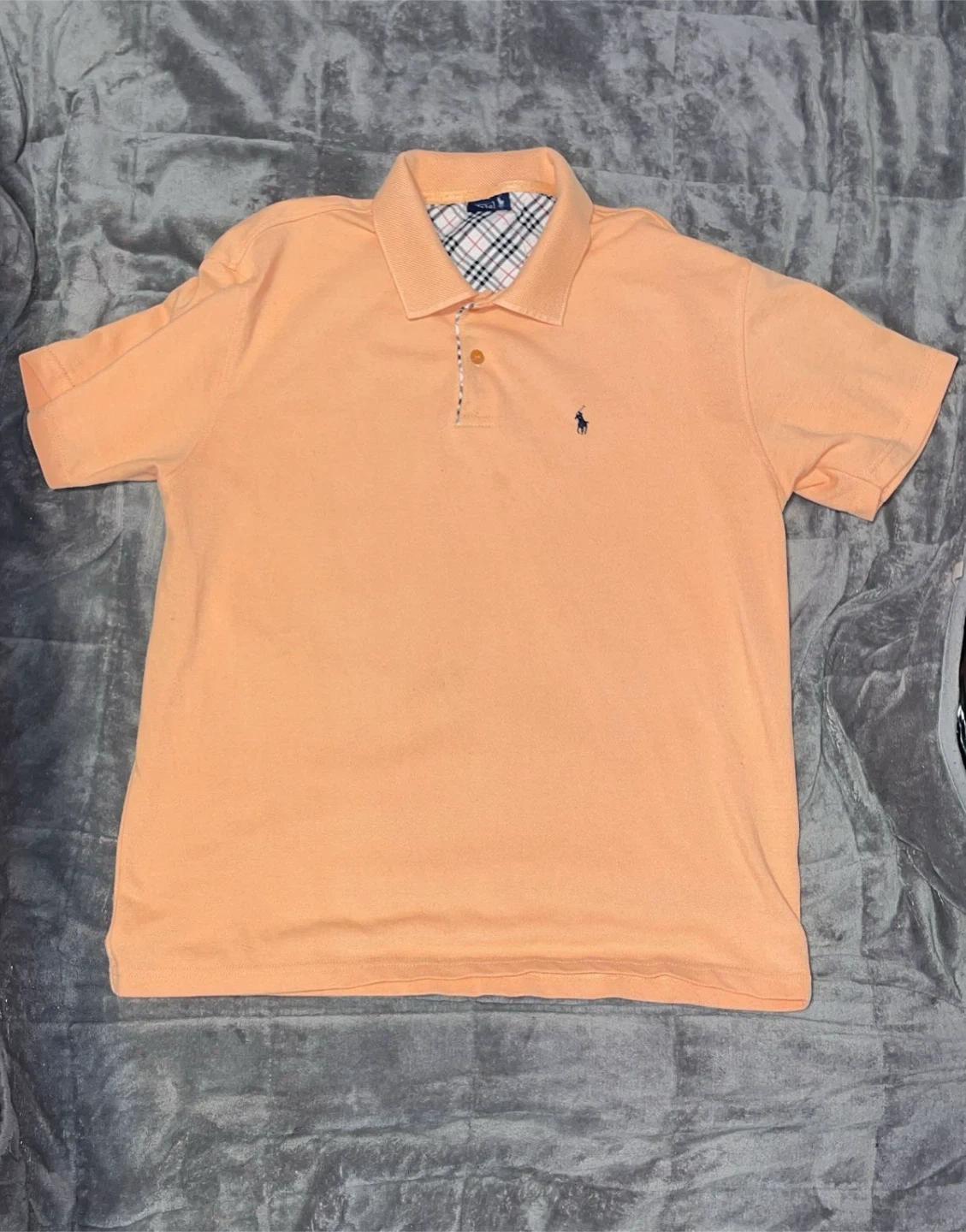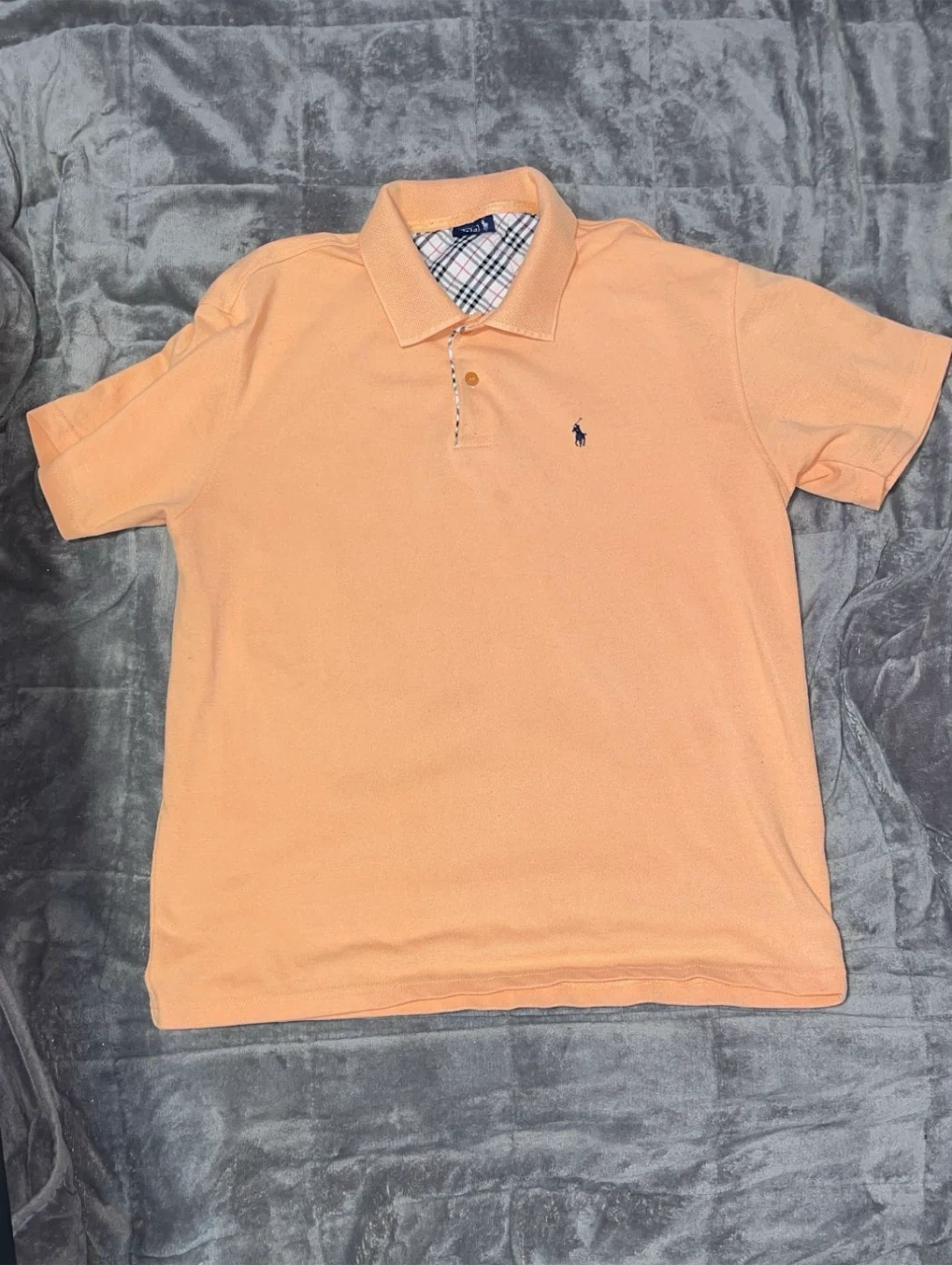 Selling a Ralph Lauren polo shirt in a lovely peach colour! It's in great condition and features the classic Ralph Lauren logo. The collar has a checkered pattern on the inside which adds a nice touch!