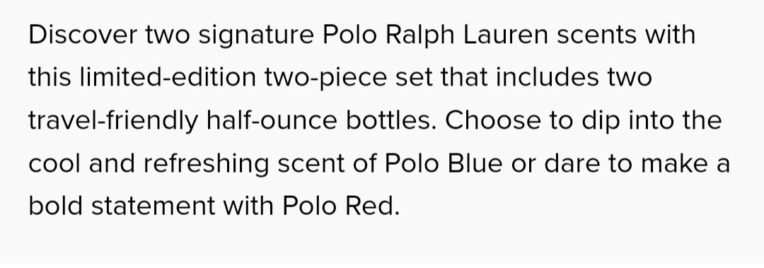 71Limited-edition two-piece fragrance gift set. Includes two travel-sized bottles of Polo Red and Polo Blue. Perfect gift or for personal use. 15ml each bottle. Cash please Inglewood