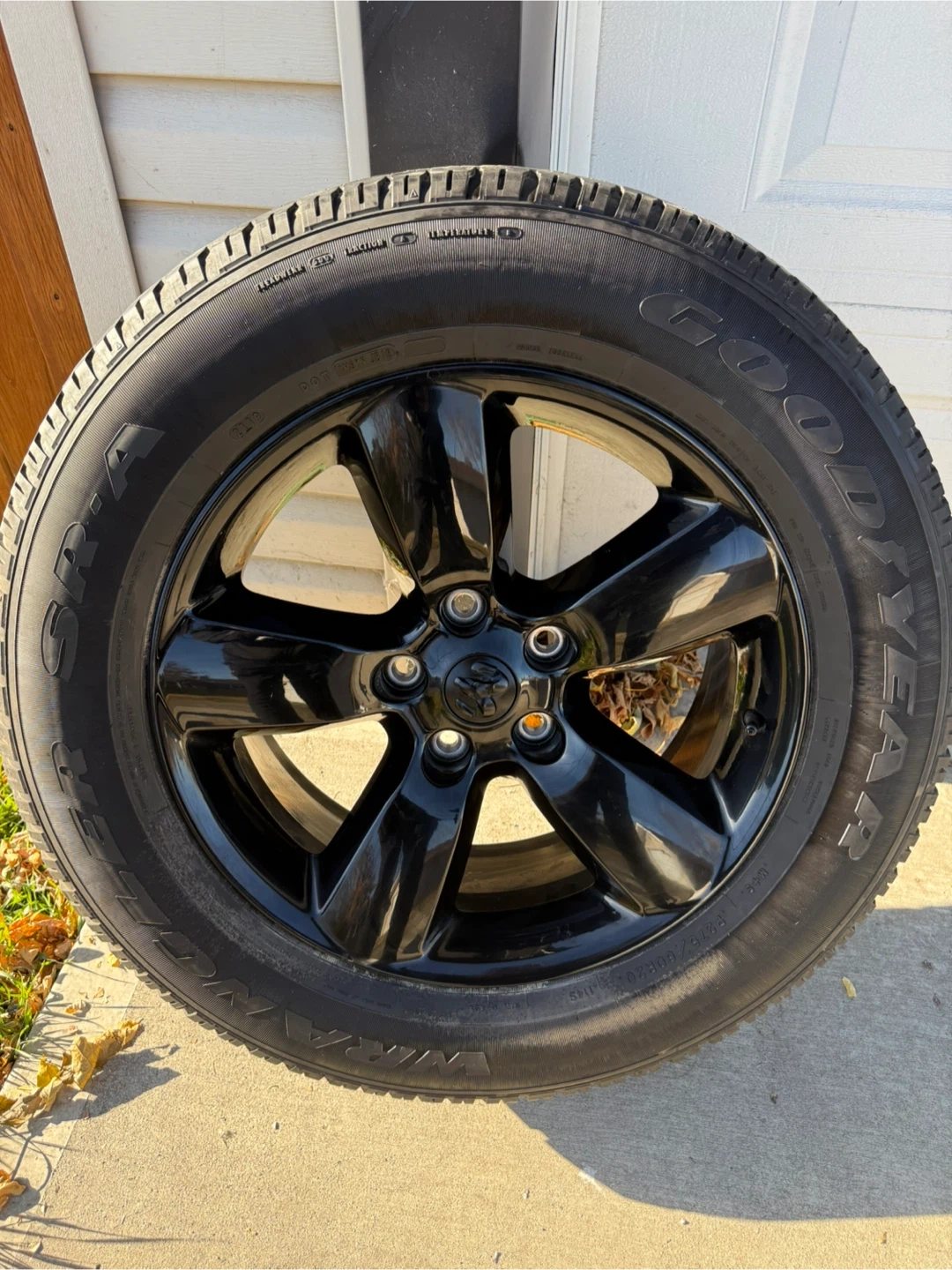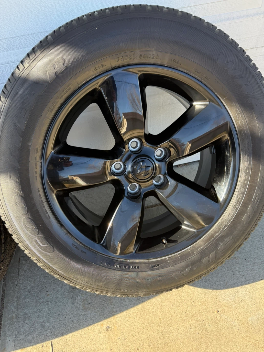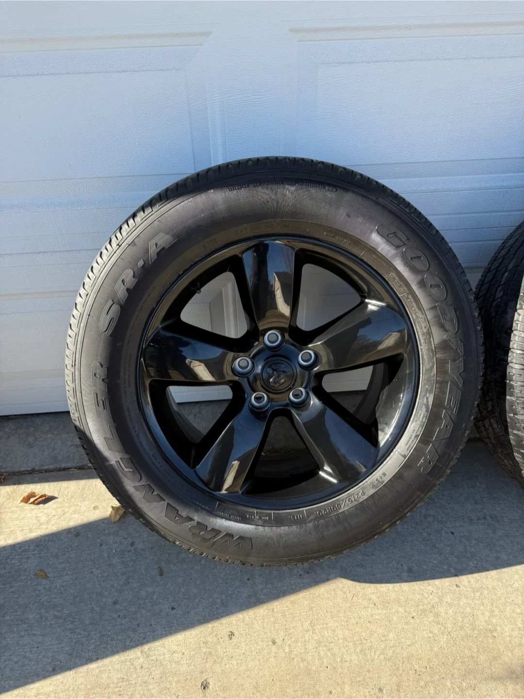 65Selling a set of gloss black rims with Goodyear Wrangler SR-A tires. The tire size is P275/60R20. They're in good condition and ready to go on your Ram 1500!