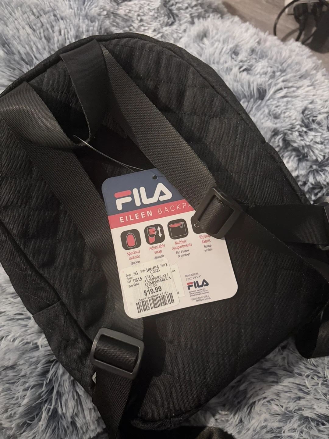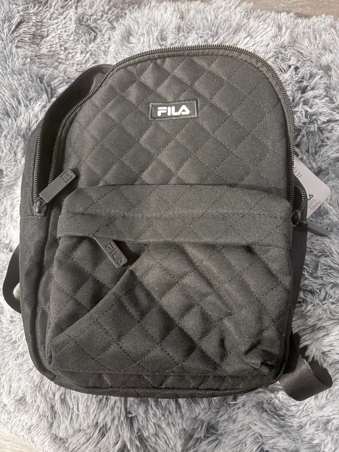 This is a Fila Eileen backpack in black. It's quilted and has a multiple compartments. The straps are adjustable for comfort. Ripstop fabric construction. Small backpack