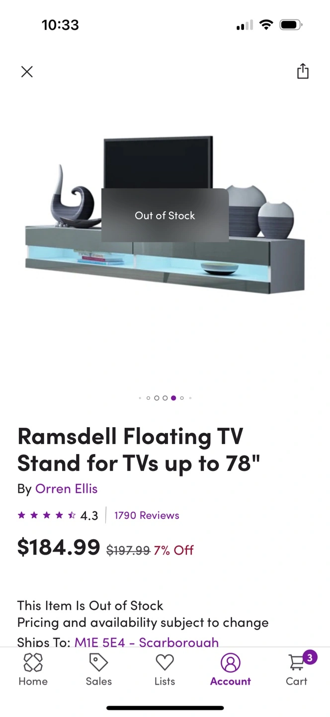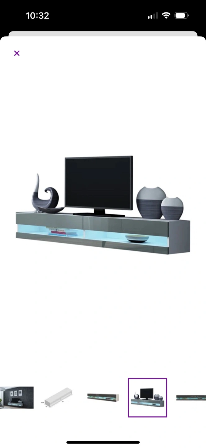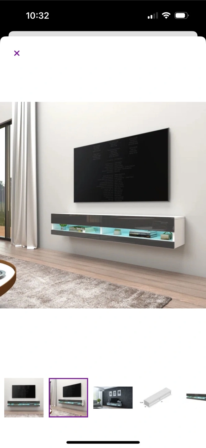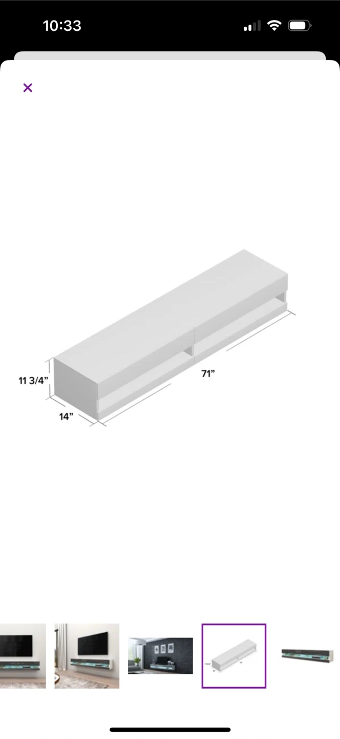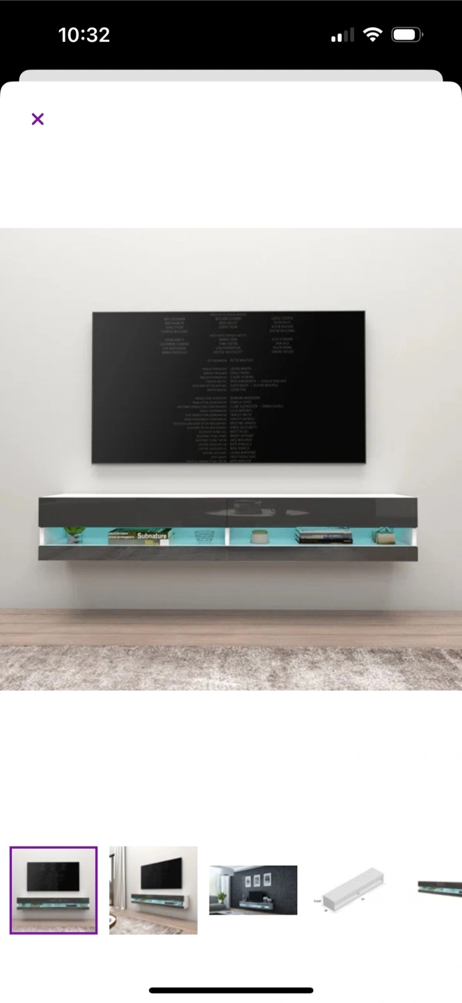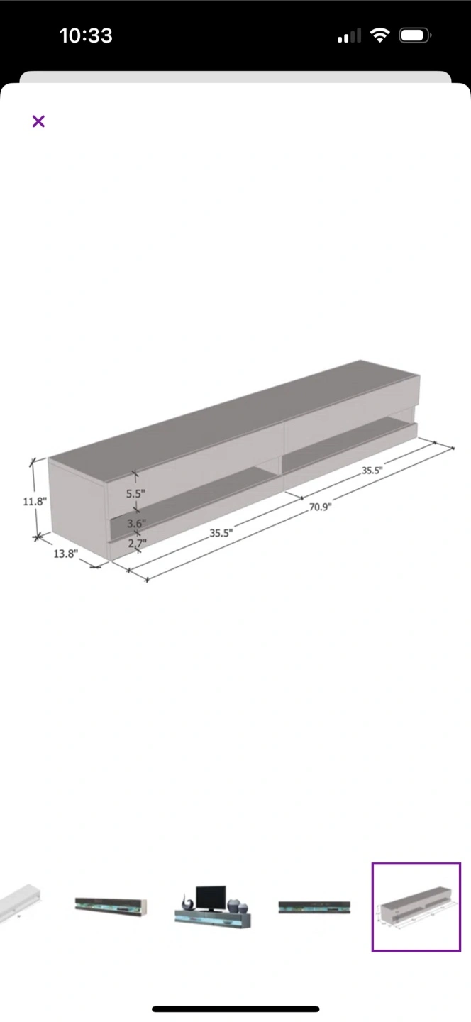 Selling a Ramsdell Floating TV Stand, perfect for TVs up to 78 inches! It's a stylish way to mount your TV and keep your space organized. The dimensions are 71" in length, 14" in depth, and 11 3/4" in height. Originally bought for $184.99