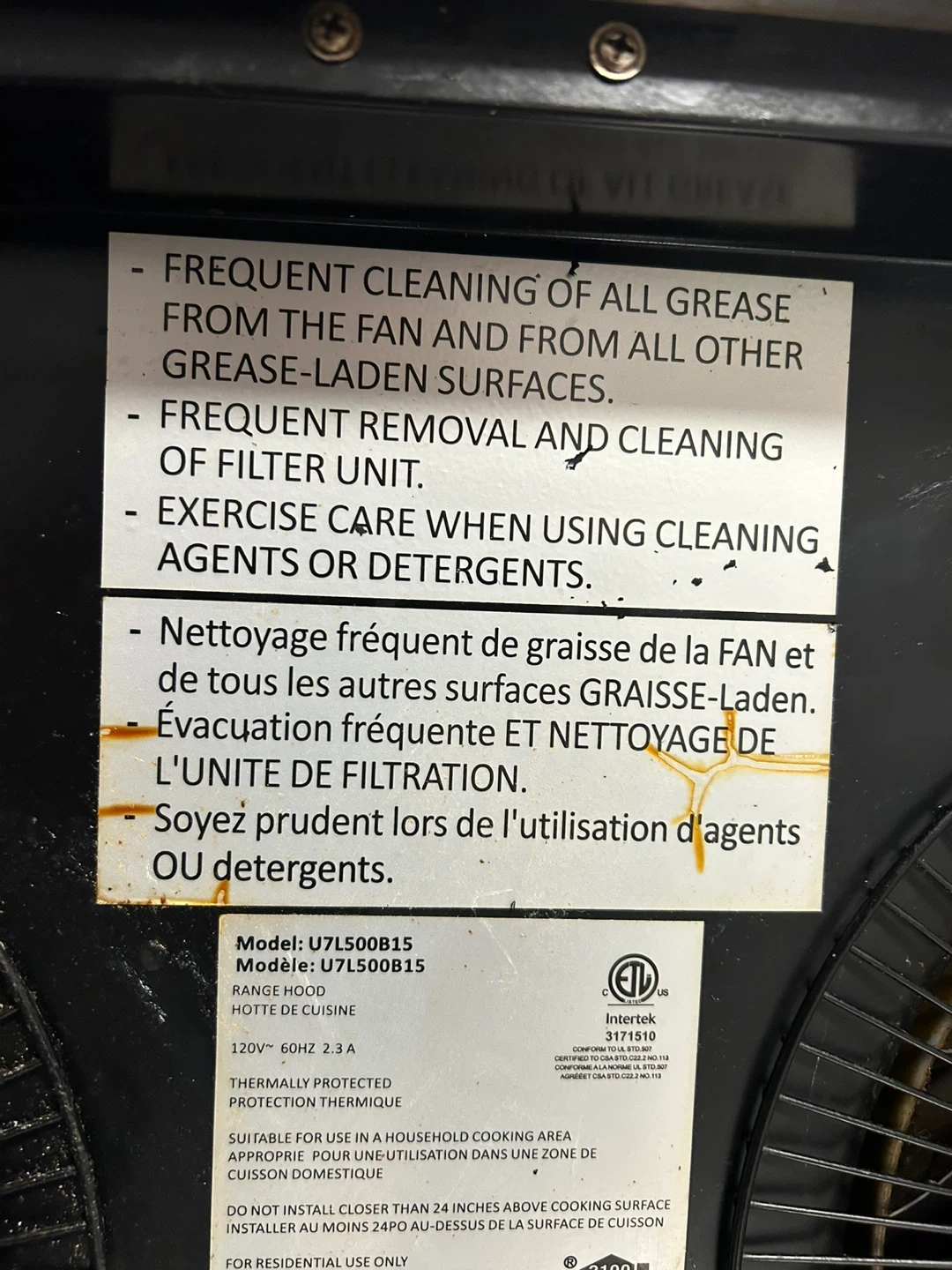 123Offering a used U7L500B15 range hood, perfect for any kitchen setup needing ventilation; it features a robust fan and integrated lights. This unit has been previously installed but is in good working condition. Additional details: * Model: U7L500B15 * Power: 120V~ 60Hz 2.3A Selling as-is, priced to sell for a quick pick-up. It's ready to extract all those cooking odours and keep your kitchen fresh as a daisy! If you're reading this, the range hood is still available for grabs!
