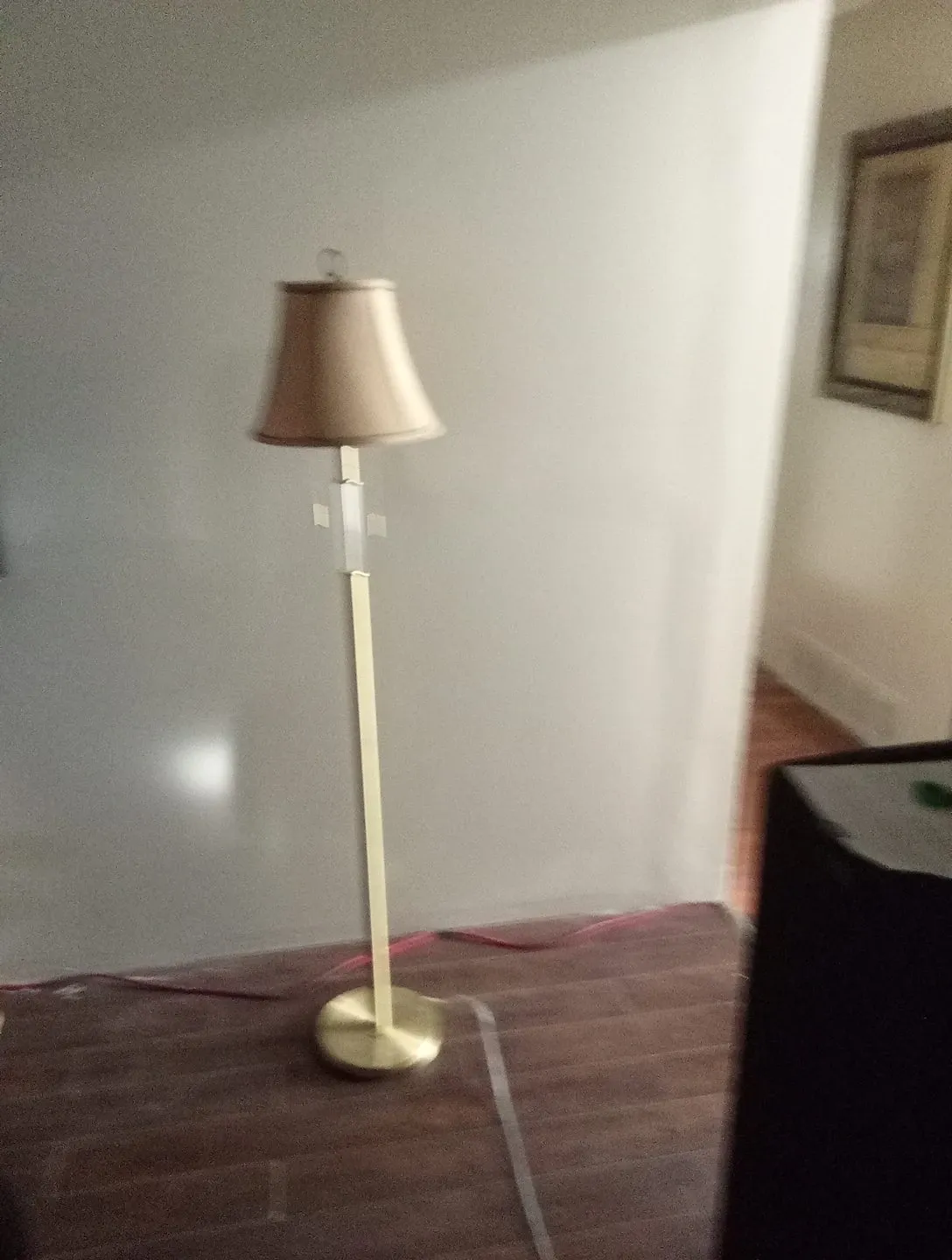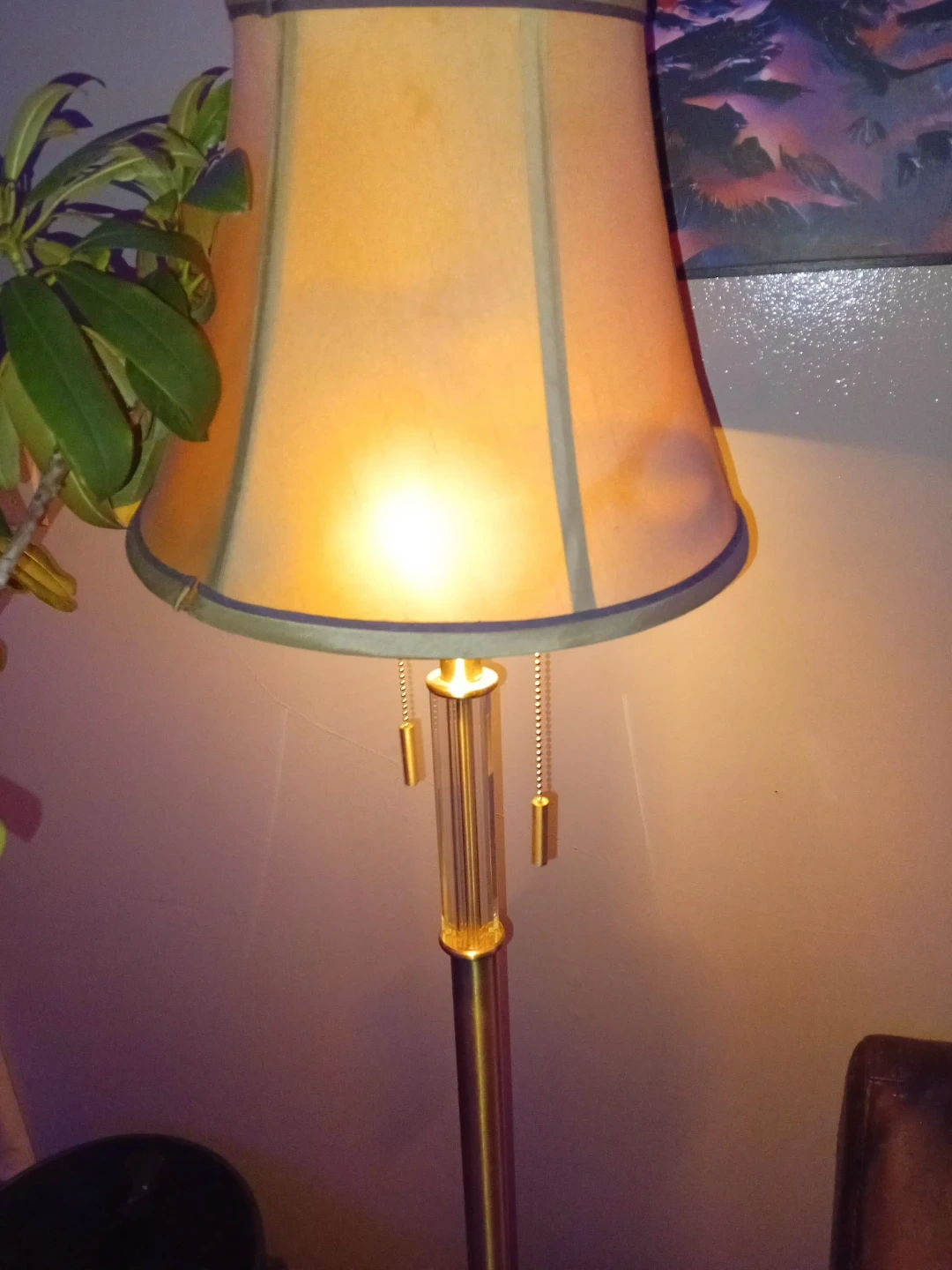 This brass floor lamp provides warm lighting for any room. It features a classic beige lampshade with contrasting trim. The lamp has a pull-chain switch for easy operation. Adds a touch of elegance to your living space!