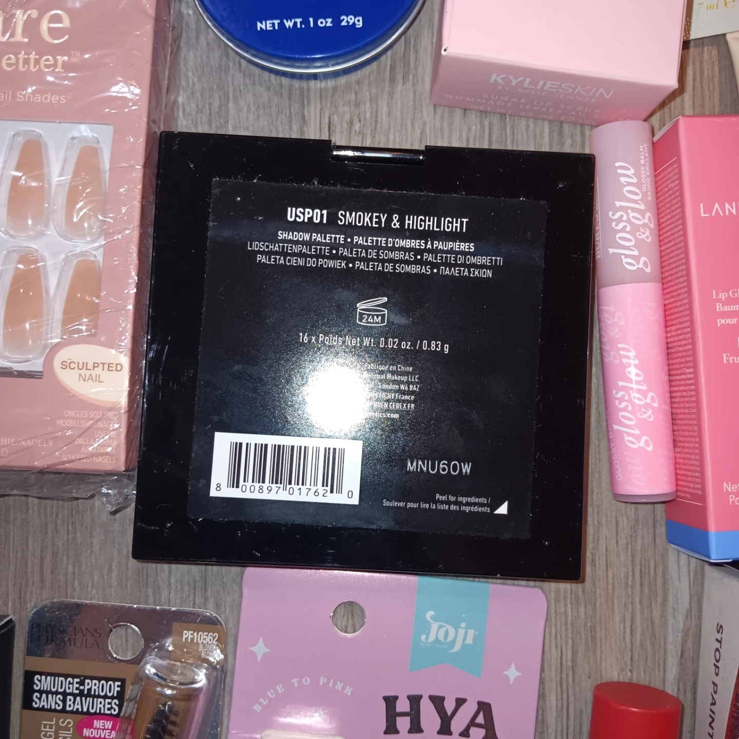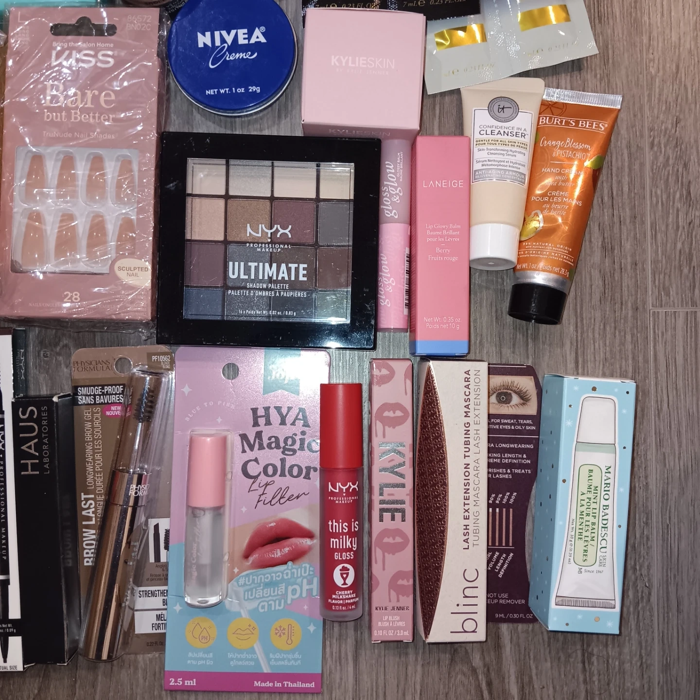 This lot includes a variety of makeup and skincare items. You'll find items like the NYX Ultimate Shadow Palette, Elf lip balms, Kiss press-on nails, and a Lise Watier eye patch. Many popular brands are included for your beauty needs.