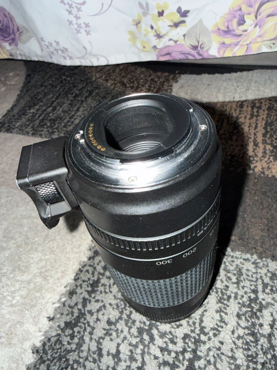 This canon lens features a zoom range of 75-300mm with an aperture of f/4-5.6. It's designed for EF to EOS M mount conversion. Includes AF/MF switch. Excellent for telephoto shots!