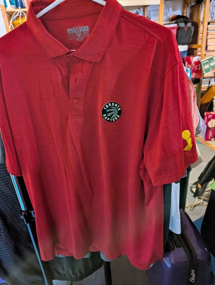 10-3 Levelwear golf shirts -$20 each or but all 3 for $45 -Raptors logo on left chest, Championship Trophy on left sleeve -Red, light grey and dark grey colors -light microfibre fabric