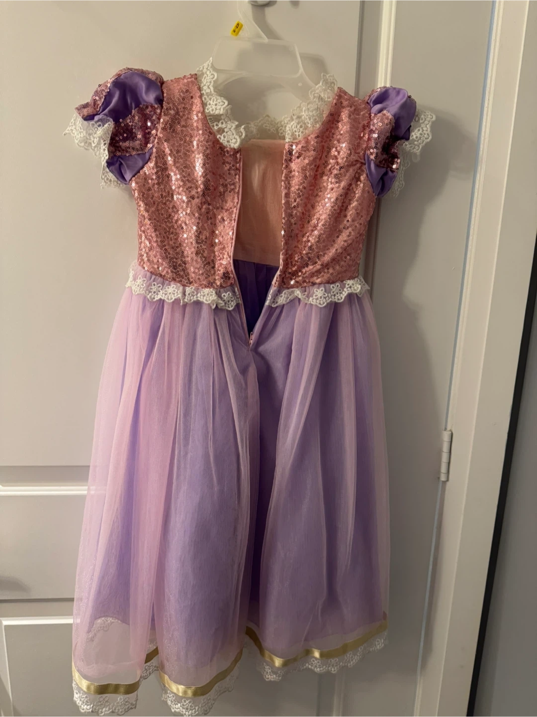 This Rapunzel dress is perfect for your little princess! It features a sparkly pink bodice, purple skirt, and lace trim. Girls size 5/6. Great for dress-up or Halloween! Pick up near Yonge and Sheppard.