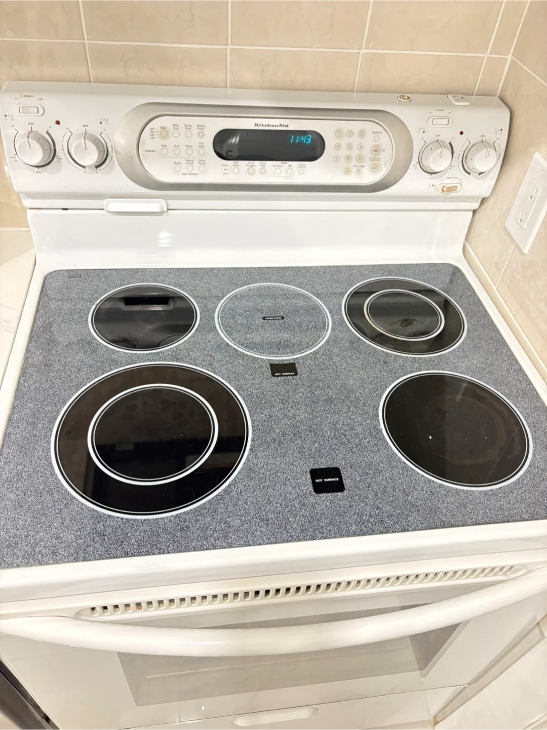 This is a white KitchenAid electric stove with a glass top and an oven. It features a digital display and four burners. The oven also includes a warming drawer at the bottom.
