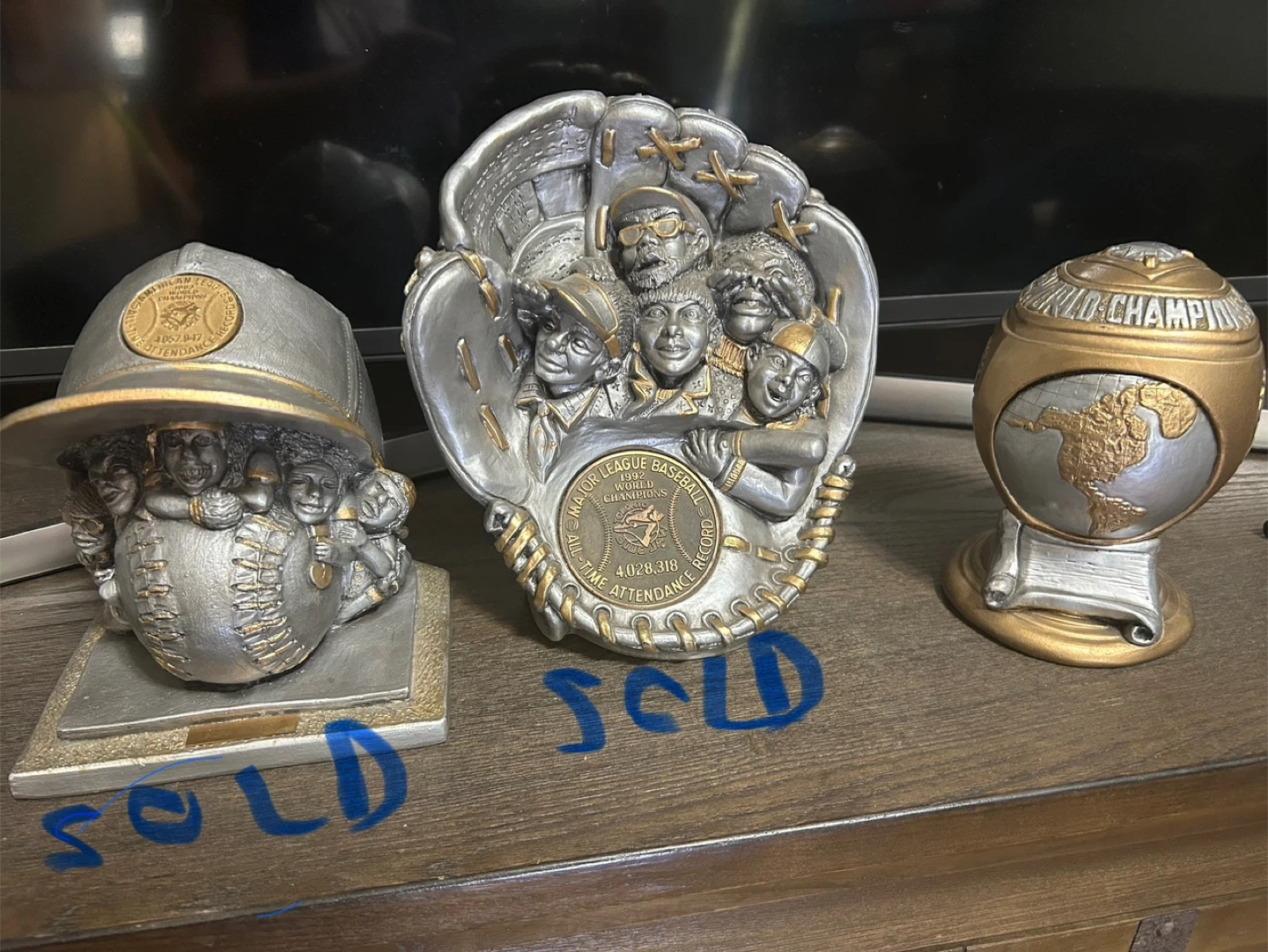 284Rare 1992 BLUE JAYS WORLD SERIES RING BASEBALL SCULPTURE Rare commemorative finely crafted sculpture of 1992 Blue Jays World Series depicting a celebration of the 1992 MLB champions. It was gifted to me as a Blue Jays employee working for the club in those celebratory years and were very limited . The sculpture is weighted and ranges about 6 inches in height. I am uncertain of the constructive materials but mostly in silver and gold colours. You can own this fine piece of Blue Jays history today! Leslie/Hwy 401