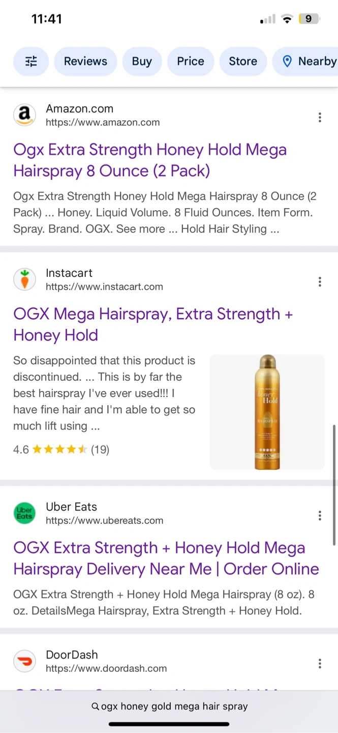 240Selling a can of OGX Extra Strength + Honey Hold Mega Hairspray. As the bottle says it will give you “seriously strong, not kidding around hold”. Perfect for keeping your hairstyle in place while nourishing them with honey and amber extract. Used twice, highly rated with 4.6 stars and retails for $56.99 when purchased online. Highly sought after, rare product and hard to find product. ❤️ Check out my other listings for great deals!